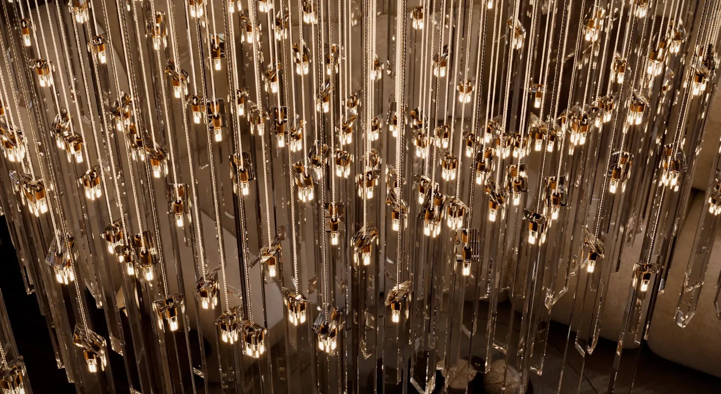 Конструкция люстры представляет собой сборку элементов из отполированного стекла, собранных вручную. Образуются линейные формы, которые изнутри подсвечиваются тонкими струйками света. Изделия из стекла создают некое мерцание, которое напоминает сияние от лучей солнца, которые пробиваются сквозь пласты льда.