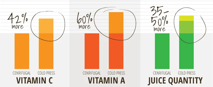 В чем плюсы такой соковыжималки? Как я обмолвился ранее, ее также называют соковыжималкой холодного отжима, в этом названии спрятана еще одна необыкновенная инновация. Поскольку обороты шнека не высоки, то наша соковыжималка не греется при работе и это делает наш отжим натуральным, т.е якобы все витамины остаются и не сгорают. Действительно, в центробежных соковыжималках, которые мы с вами обсуждали ранее, плод измельчается на диске-терке, который вращается с скоростью около 1000 оборотов в минуту, ученые утверждают, что за счет этого теряется около 10% полезных свойств (витамины и прочее) плода по сравнению с шнековой технологией.