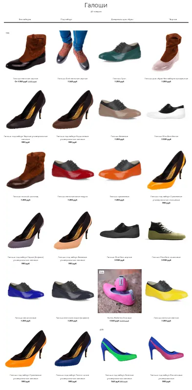 Даже на туфли с каблкуками, оказалось, есть галоши ( правда их полезность мне очень сомнительна как то ) :-) Что там за материалы - надо разбираться. Но совсем не только силикон. Есть и так называемые дождевики для обуви (белый на картинке как раз похож на ваше фото)