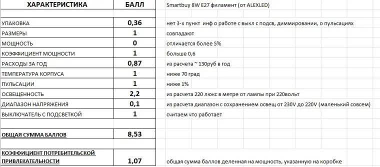 @ALEXLED Спасибо! Отлично и подробно. По тому, что есть в тексте и на фотографии коробки я заполнил таблицу баллов, недостающие данные расход за год - взял 130 руб , освещенность в метре при 220V - взял 220 Люкс и предположил, что лампа работает с выкл с подсв. В таком случае получаем сумму баллов - 8,53 Коэффициент потребительской привлекательности 1,07 Диапазон напряжения на входе плоховат и , общая болезнь "не первых" - завышена мощность В остальном, действительно, выглядит неплохо, особенно если и тест временем пройдет