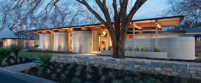 Этот стартап из Америки занимается печатью различных домов на 3D-принтерах. Однако вместе с архитектурной компанией Lake-Flato было решено открыть линейку одноэтажных дизайнерских проектов. Первым был представлен дом House Zero, который отнесли к категории элитной недвижимости. Основа таких домов, конечно же, «зеленые» технологии. Дом House Zero в стиле «ранчо» был размещен в Остине, штат Техас. В нем присутствуют классика и футуристический декор. Внутри дома изогнутые стены, напечатанные на 3D-принтере, есть стеклянные и деревянные элементы. Дизайнеры и архитекторы не стали скрывать следы струйной печати, которую можно будет увидеть в форме послойной укладки. Дом на 185 кв.м с тремя спальнями, двумя ванными комнатами, большой гостиной и кухней. Снаружи примыкает блок для гостей, где также есть спальня и ванная. В создании проекта принимал участие массивный 3D-принтер Vulcan, а также запатентованная смесь Lavacrete и алгоритмы машинного обучения для контроля всего процесса постройки. Сотрудники компании также приложили руки, когда основная конструкция была напечатана. Они устанавливали окна, двери, монтировали коммуникации, утеплители и стальные блоки. Данная модель дома пока хотя и готова полностью к проживанию, поедет на выставку в качестве экспоната для фестиваля SXSW в Остине, посвященному музыке, кино и передовым технологиям.