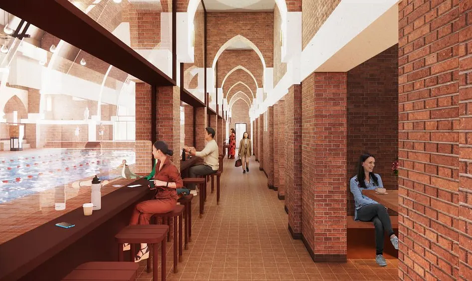 Большую часть интерьера менять не будут. Потолок и стены, которые сделаны из дерева, покрою защитными экранами от влаги. Кафедра станет вышкой спасателя, а вот скамьи будут переделаны под места отдыха и барные стойки. Пол покроют мозаикой, которая будет вторить дизайну церковных витражей.