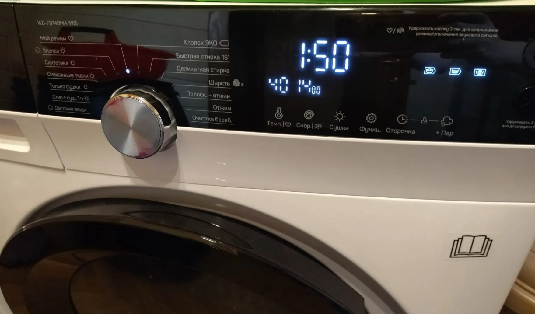 Высокая скорость отжима — до 1400 об/мин. Не знаю для чего нужен настолько мощный отжим белья, но он есть и не ограничен 1200 как в обычной машинке.