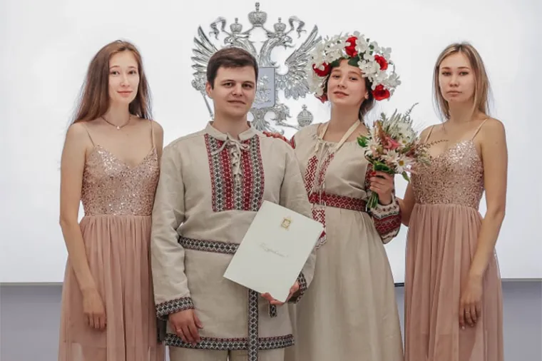 Глеб и Наталья Новиковы после 5 лет знакомства решили пожениться, так как скоро у них появиться малыш. Однако это не помешало молодой паре озадачиться созданием праздника и необычной свадьбы. Все началось с колец со славянской символикой «Свадебник». Именно эти кольца и подкинули идею создания славянской свадьбы. Были куплены свадебные костюмы из льна с орнаментами в национальном стиле. Девушка своими руками сплела оберег из бисера с символом «Рожаница». И про букет не забыли, поэтому собрали его из того, что росло на даче.
