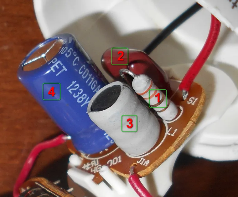 На одной плате собран выпрямитель . Тут все как любит Светотехника. Резистор-предохранитель (1), пленочный конденсатор (2), дроссель (3), электролитический конденсатор правильной фирмы 3,3 мкфх400В (4).