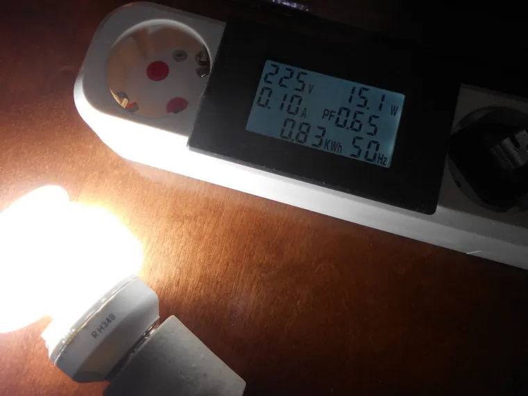 Фактически потребляемая мощность лампы 15,1 Вт , после прогрева 13 Вт.