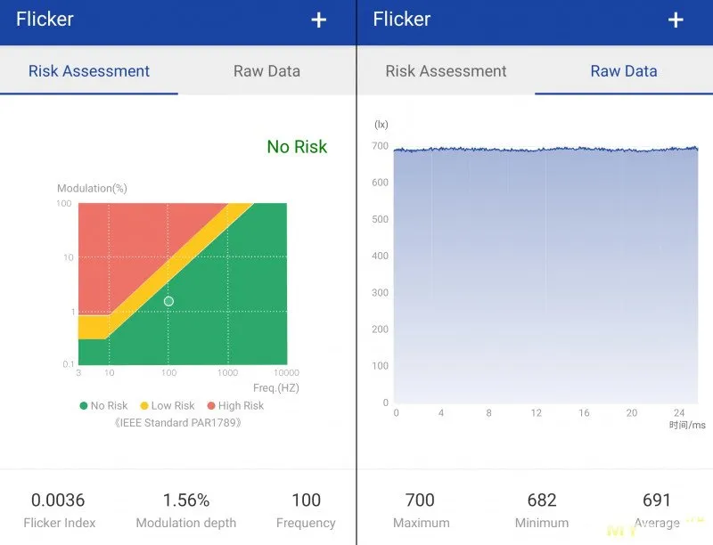 Что с пульсациями света от этой лампы? Смотрим. Пульсация где-то в пограничной зоне. Это мне не нравится. Подсказывает прибор, что есть небольшой риск. И действительно 5,76% на небольшой частоте 100 Гц.