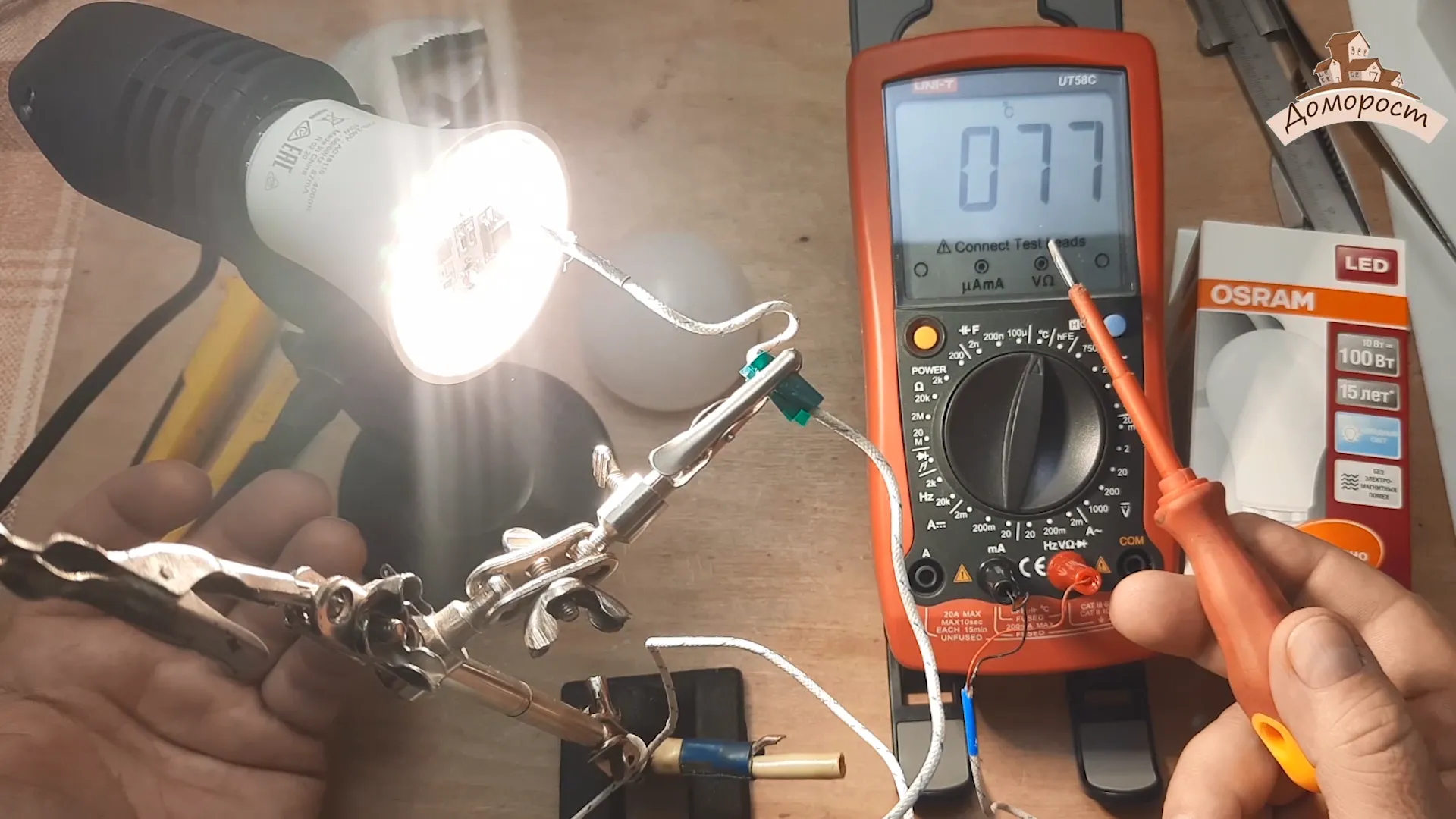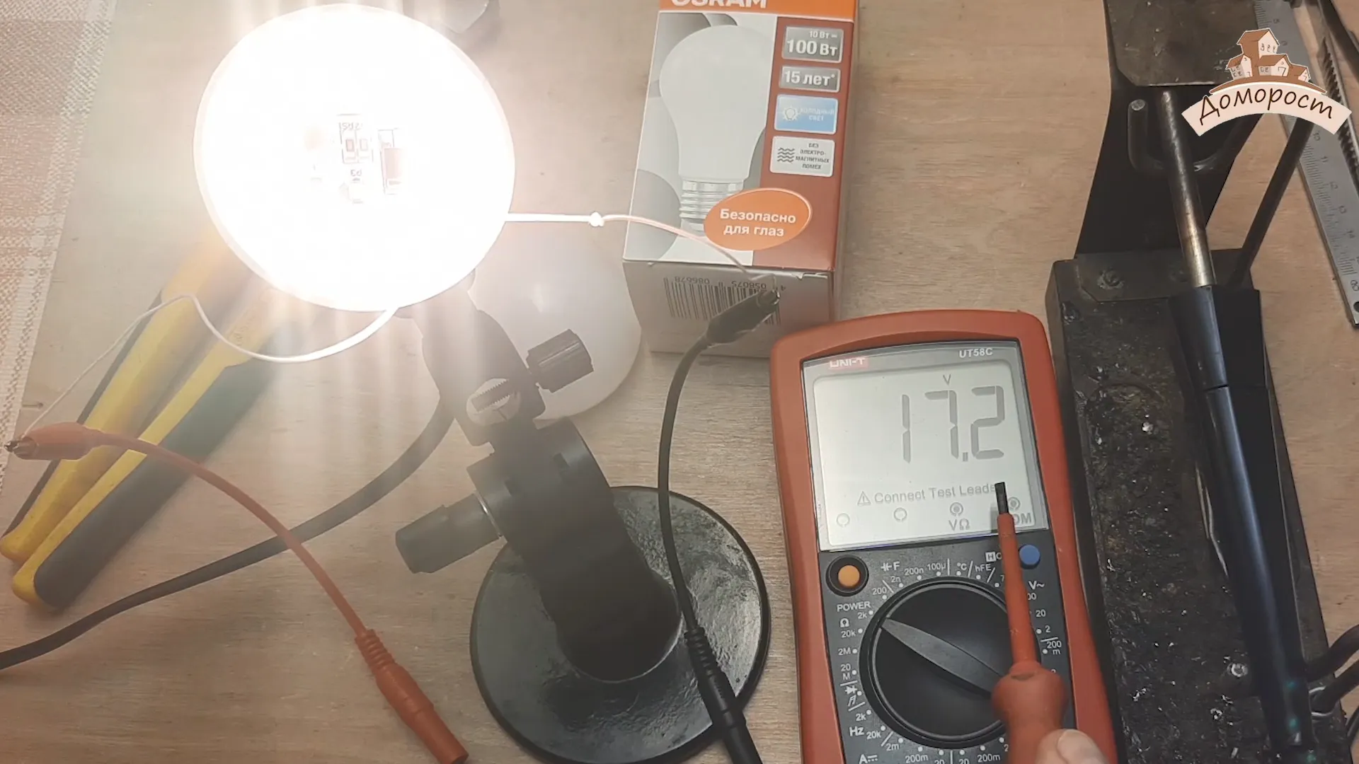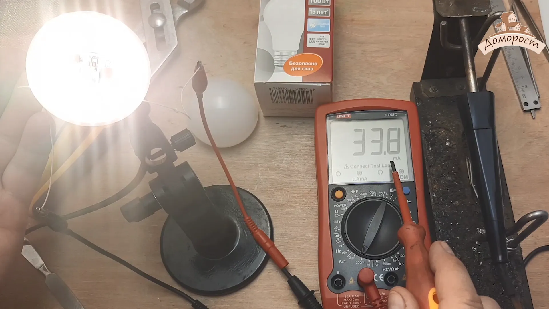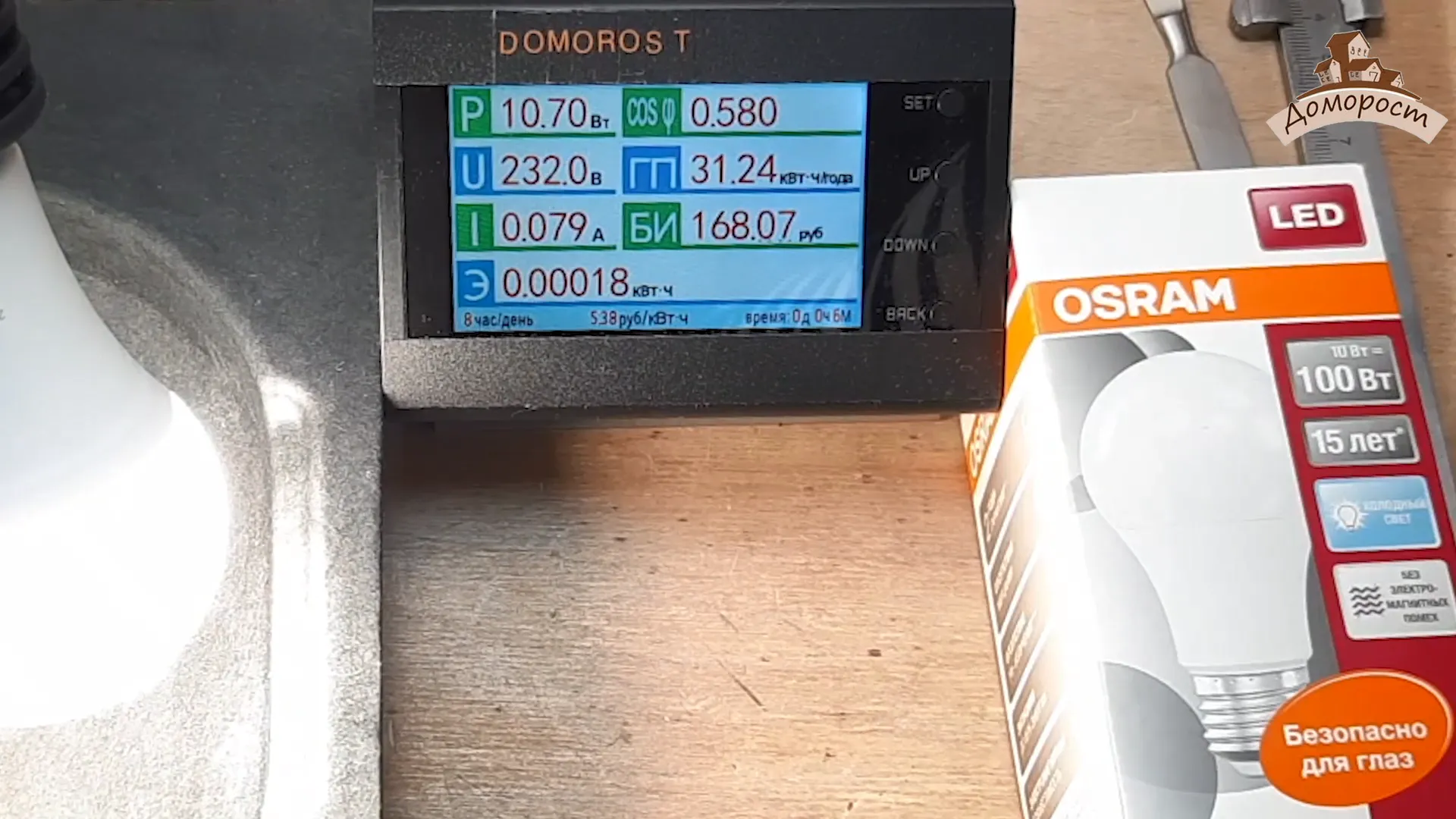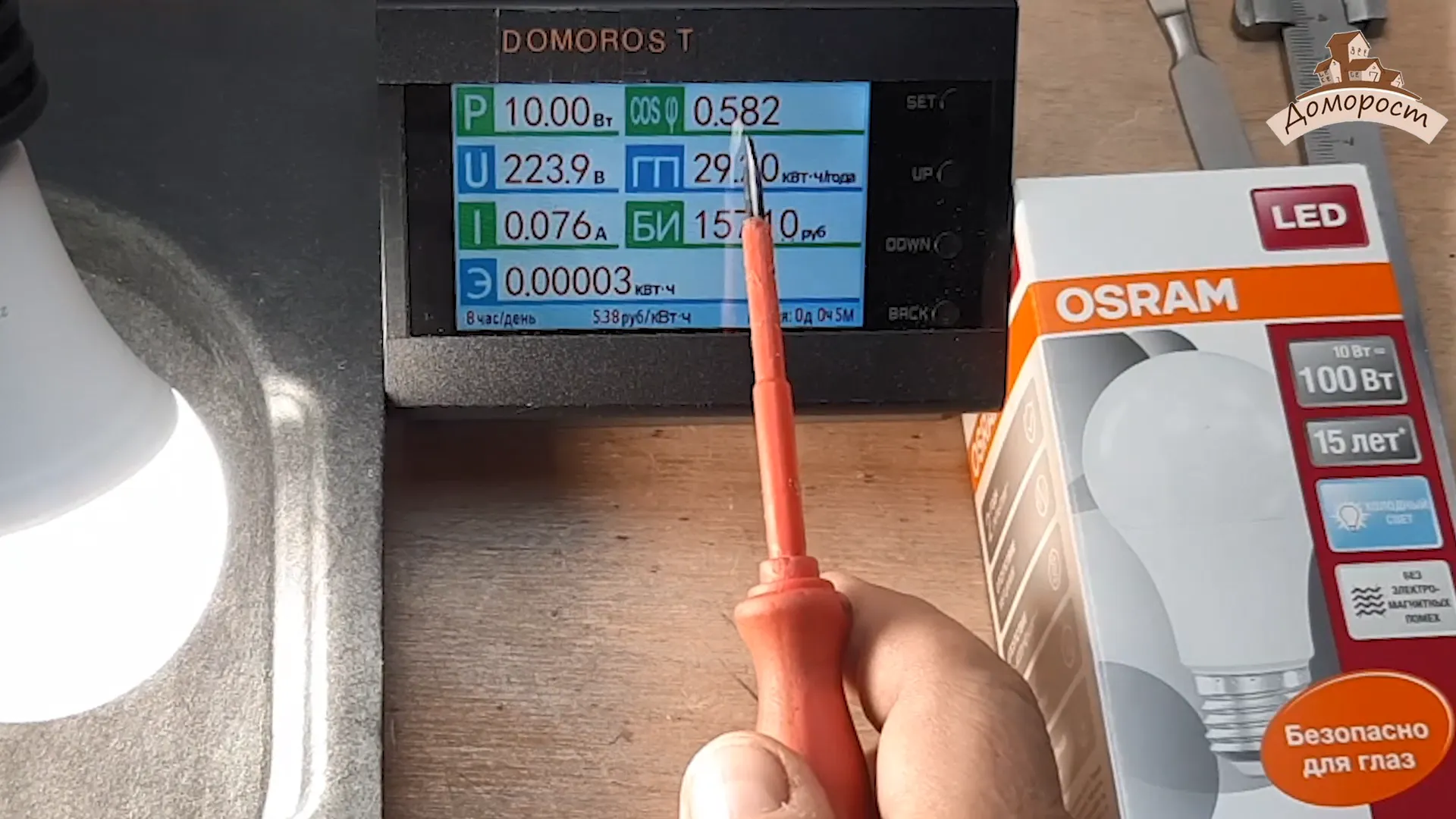 Итак, прежде всего измерим мощность. Производитель утверждает, что лампа обладает 10 Вт мощности.