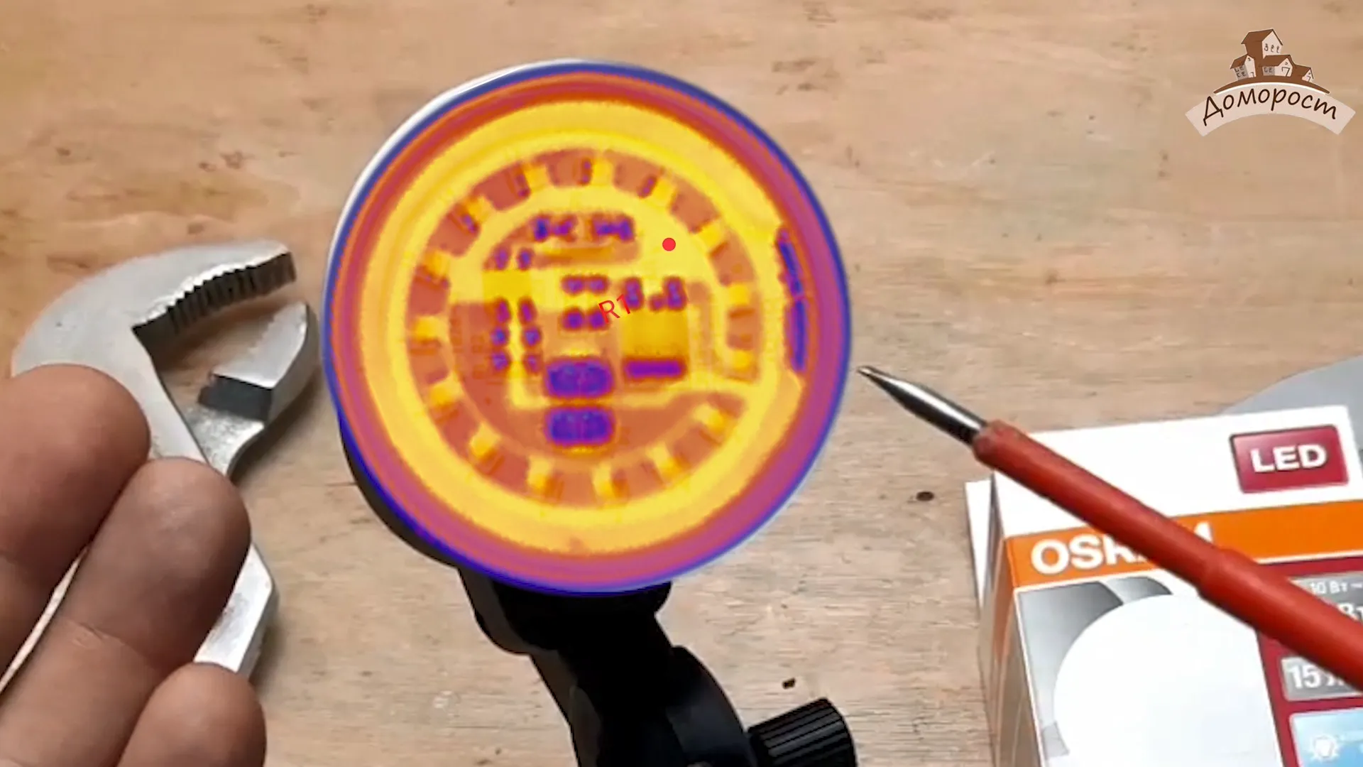 Использую тепловизор, чтобы найти наиболее горячую точку диодной платы, к которой далее прикрепляю термопару.