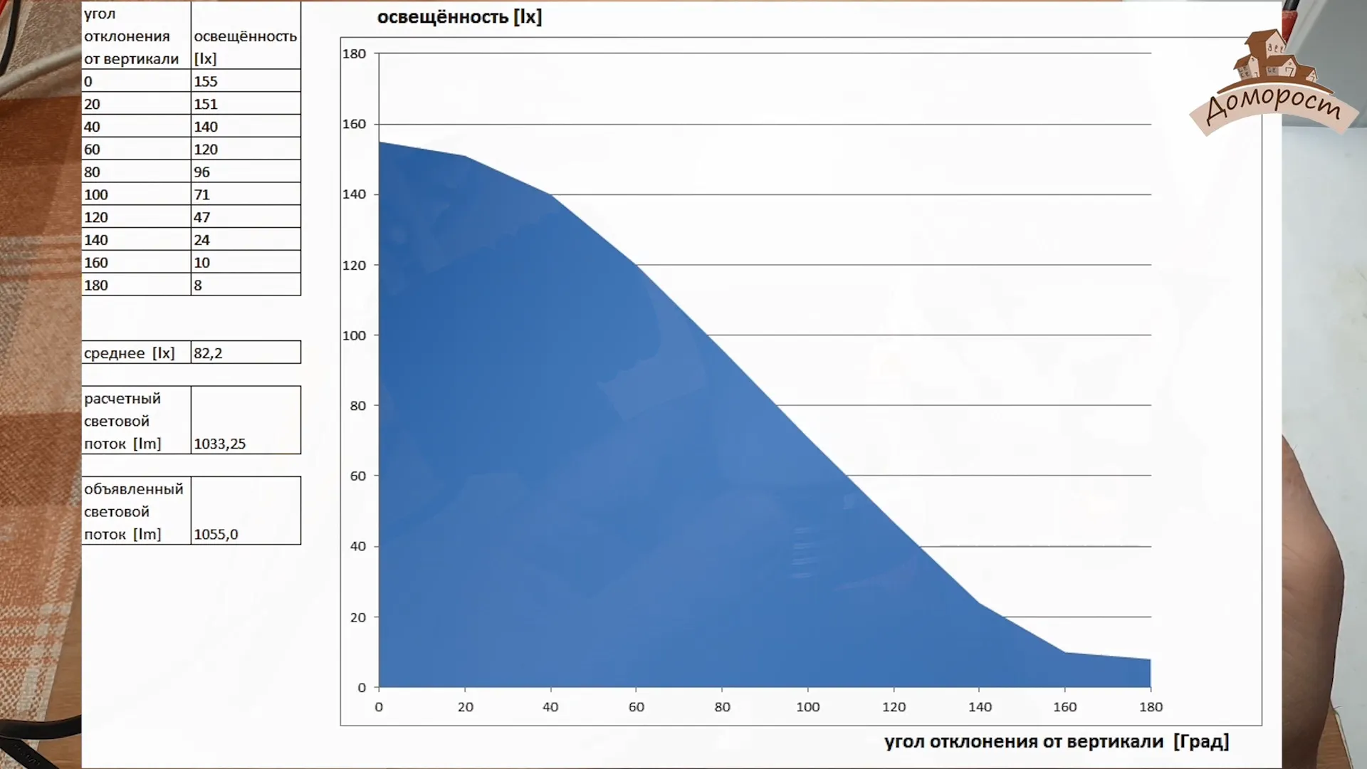 Измеренный мною световой поток светодиодной лампочки получился равным 1033 Люмен, в то время как производитель указывал 1055. Хорошее соответствие.