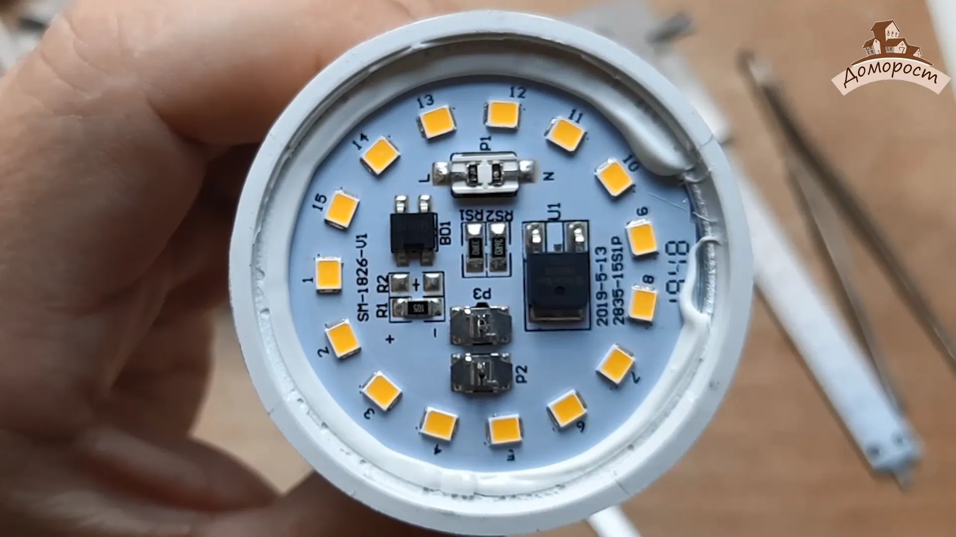 Под рассеивателем нас встречает светодиодная плата с 15тью корпусами светодиодов и очень обильным слоем клея-герметика. Драйвер греется там же, где и светодиоды.