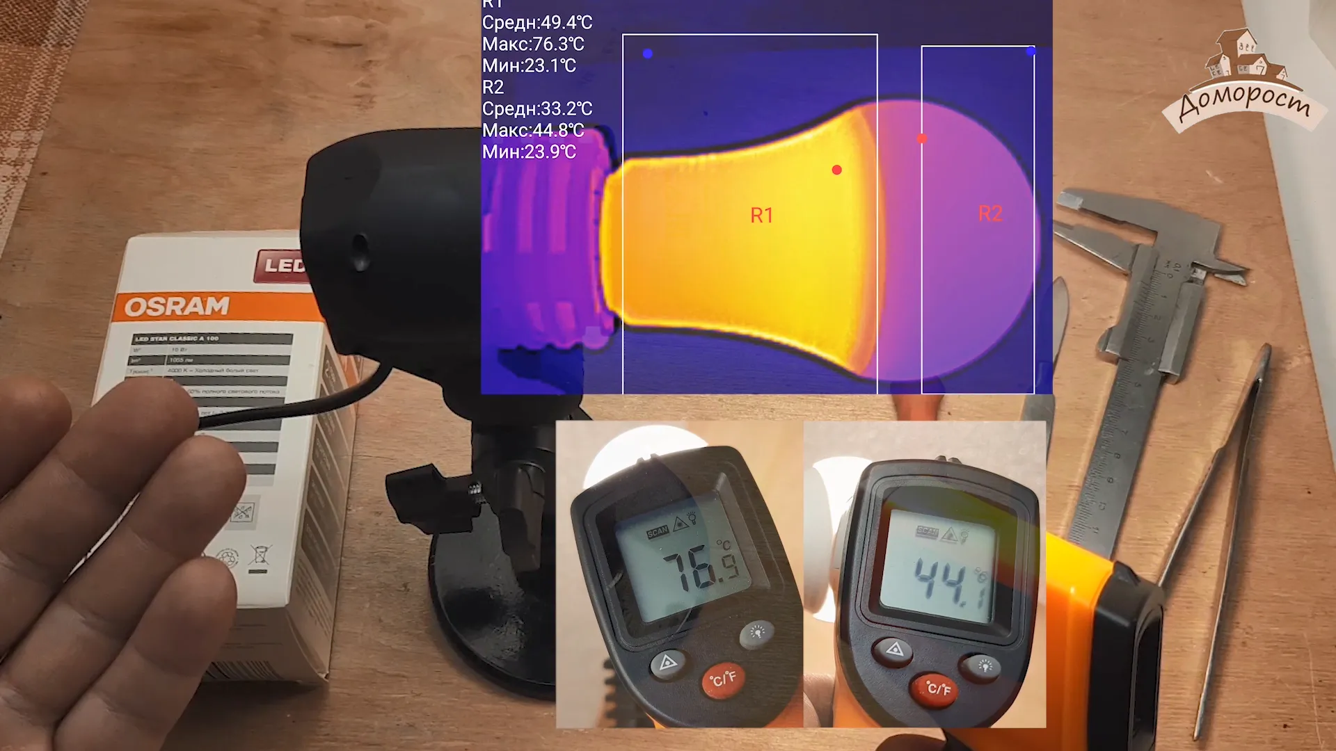 Колба лампы нагревается до 44 градусов по Цельсию, в то время как самая горячая точка корпуса ровна 76 градусам.