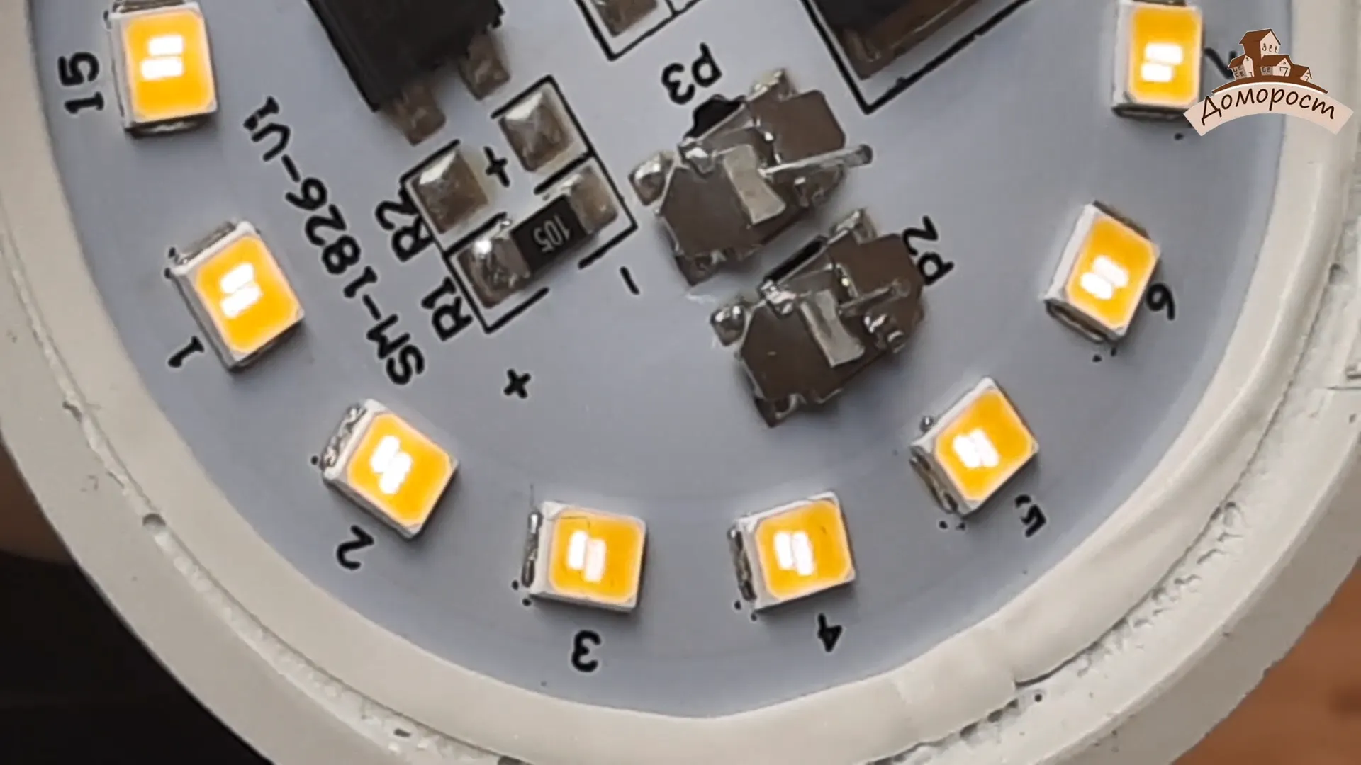 Под люминофором угадываются по два кристалла светодиода, но это надо будет еще уточнить. Все светодиоды соединены последовательно.