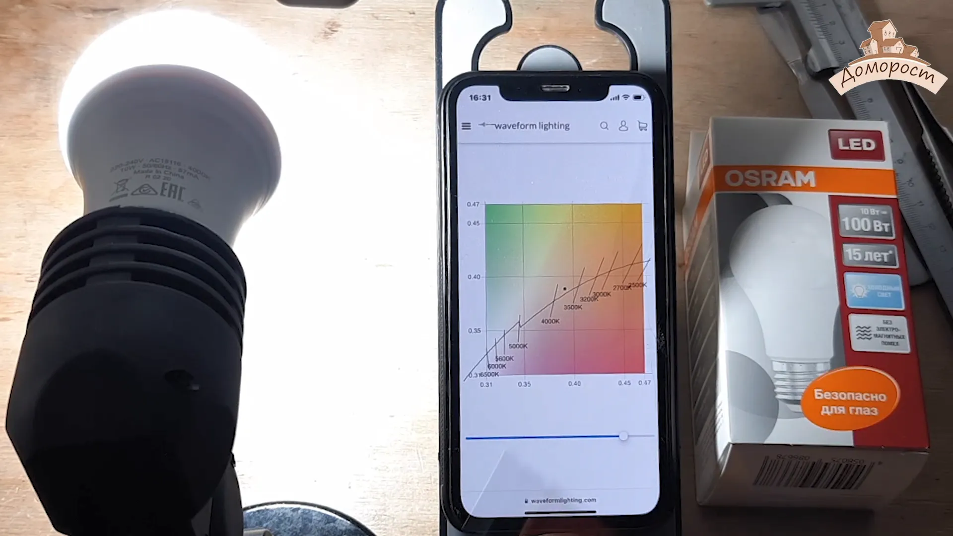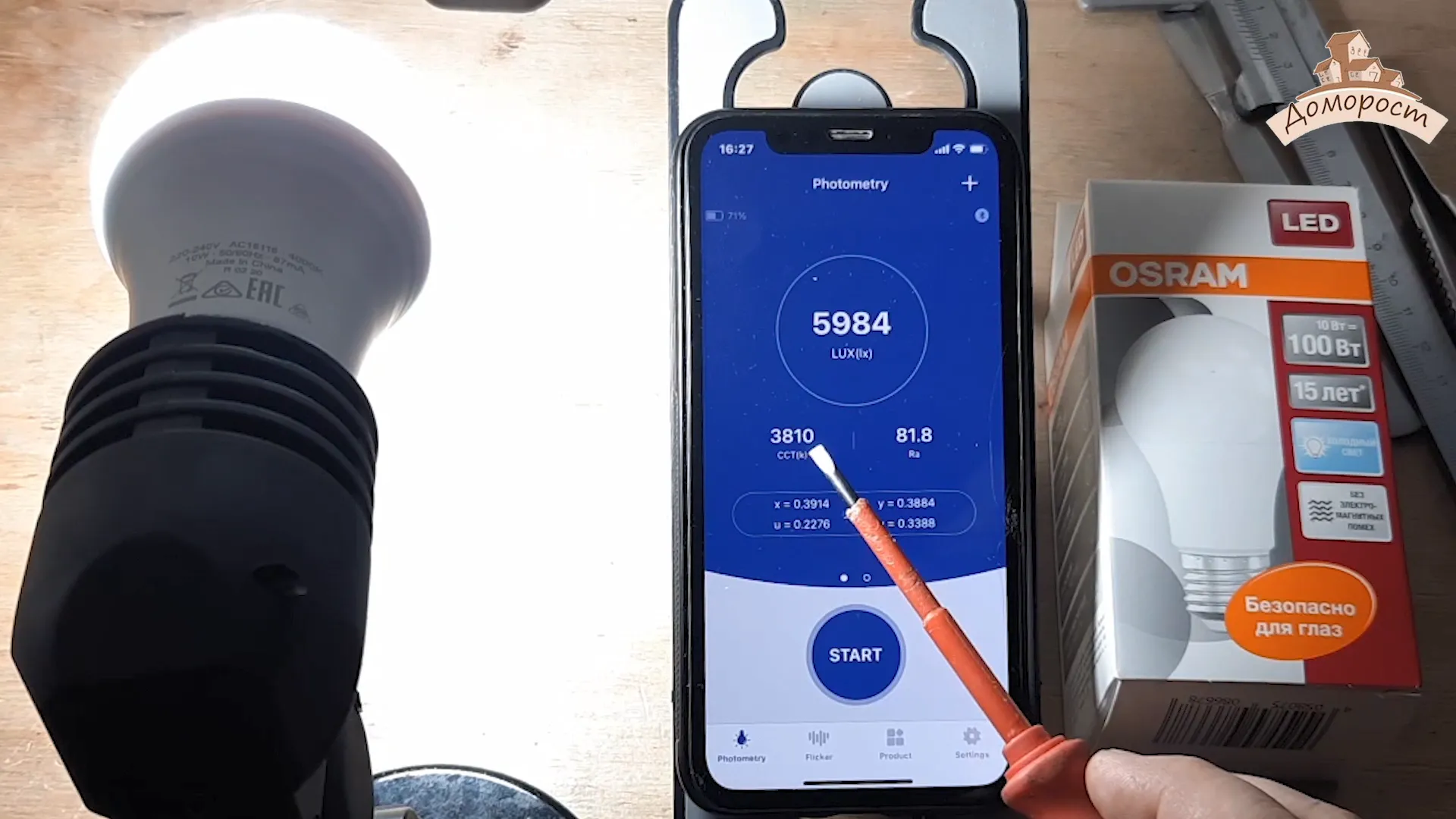 Теперь проверим характеристики света светодиодной лампочки Осрам. Цветовая температура 3800 К, индекс цветопередачи 81.