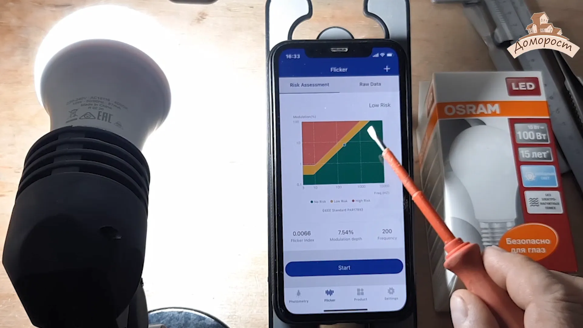 Теперь пульсации. Исходя из моих измерений, лампа находится на граничной области безопасного излучения. При таком граничном состоянии я не могу поручиться за то, что она будет безвредной для ваших глаз. Очень жаль, что Осрам не смогли пройти этот важный тест.