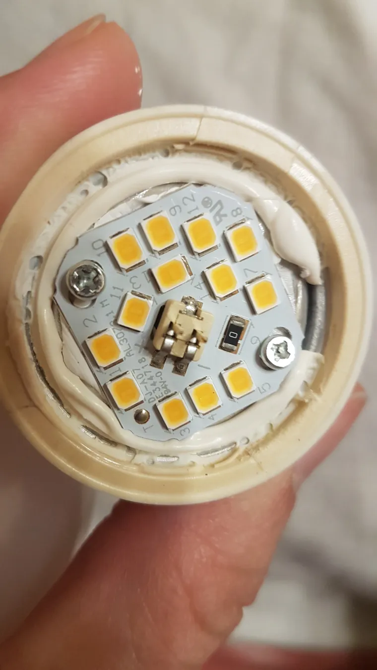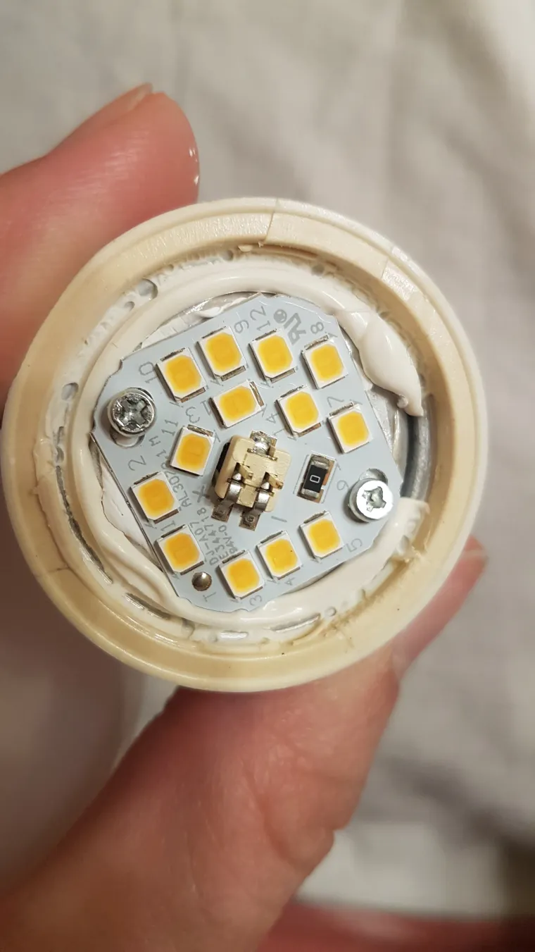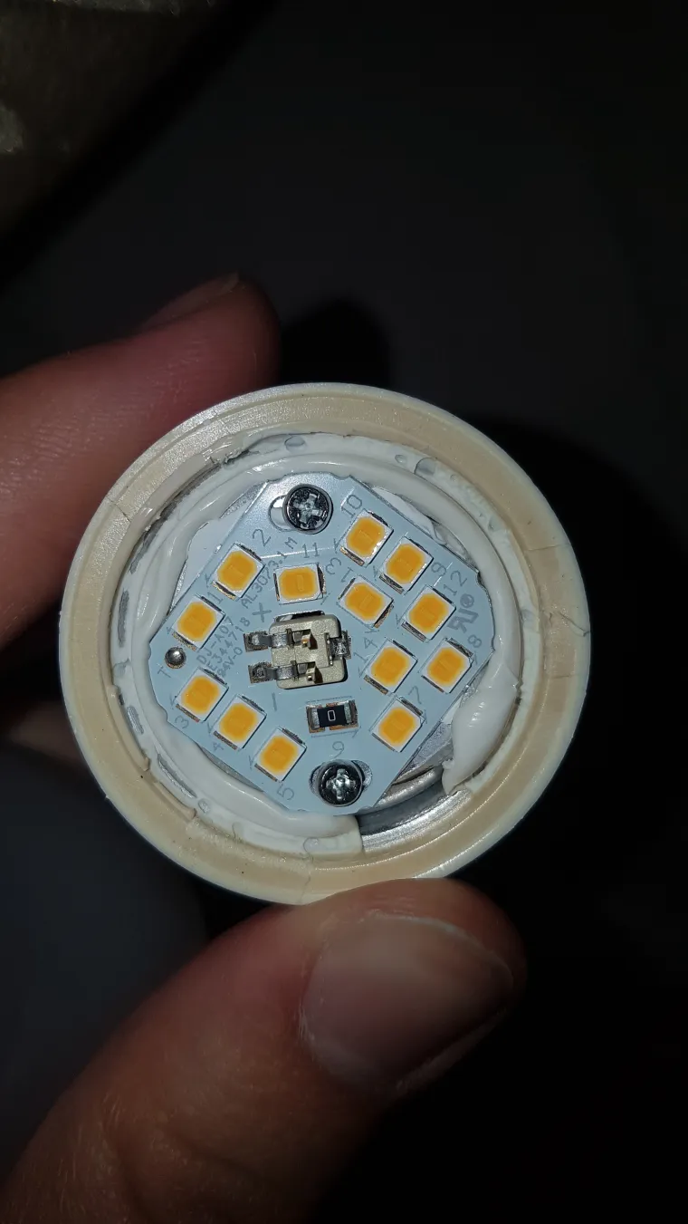 По ощущениям у них в какой то степени упало качество света, вспоминая как они светили 3 года назад... в декабре 2018, когда я их только купил. Пожалуй яркость упала на процентов 15 и изменился цвет ламп, они вроде были более желтые. Ну все в этом мире деградирует когда нибудь, особенно светодиодное освещение, деградировать - это его второе имя. Приступим к внешнему осмотру лампочек, что с ними случилось за эти 3 года работы: