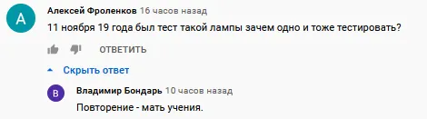 @Светотехника не обращайте внимания, лампы не просто можно, а НУЖНО одинаковые тестировать спустя время. А у Вас они всегда разной мощности. Алексей этот еще маловат, ему сложно тонкости обзоров светотехники понять, надо ему объяснить подробно.