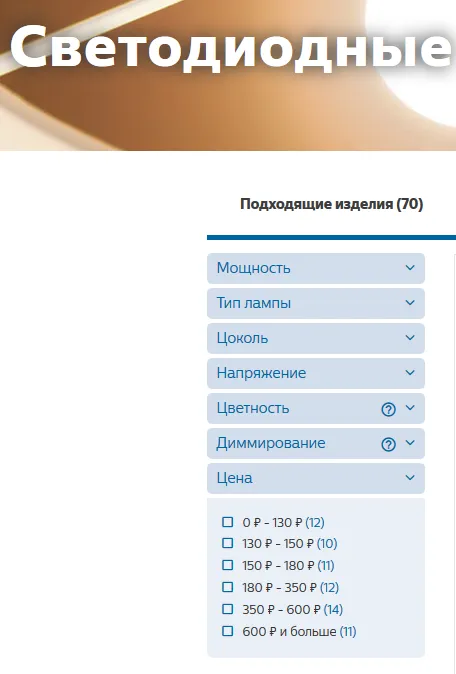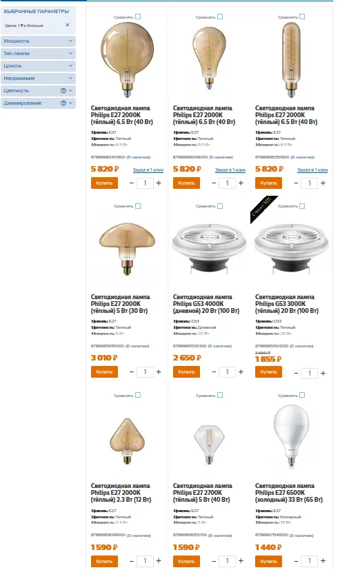 Сколько именно ламп Philips предлагает магазин и в каком ценовом диапазоне, это отлично видно на прикрепленном скриншоте.
