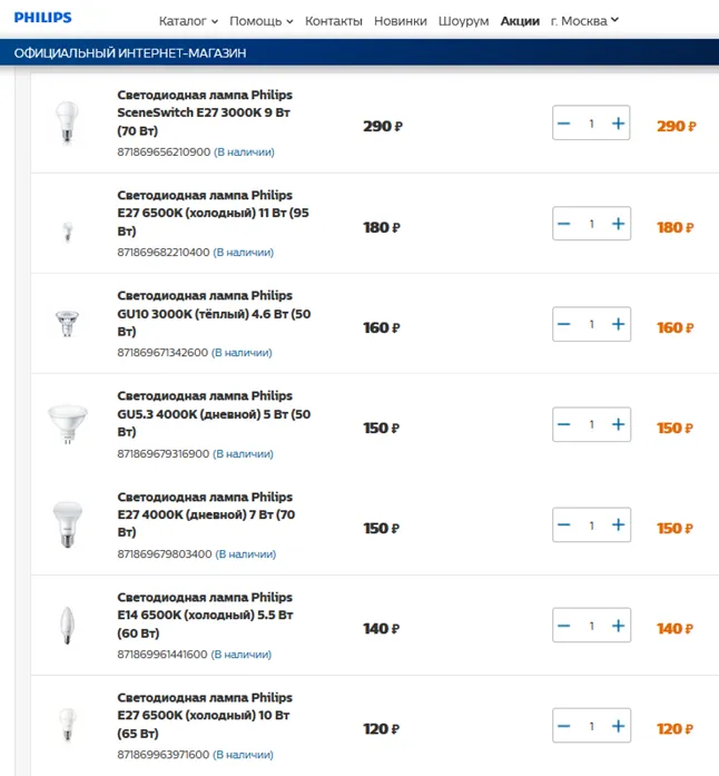 Или официальный интернет магазин Philips в городе Москва имеет очень ограниченное предложение светодиодных лампочек Philips?