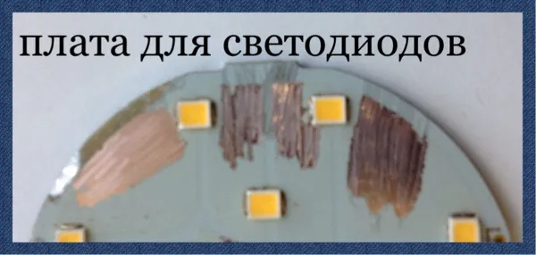 Алюминиевая, толщиной около 2мм теплоотводящая подложка, на ней тонюсенькое покрытие из диэлектрика, очень похожего на привычный стеклотекстолит ( похоже это и есть стеклотекстолит , толщиной доли миллиметра) . Поверх стеклотекстолита честные медные печатные проводники ( широкие, на меди тоже , молодцы производители, не экономили) монтажной платы, к которым припаяны корпуса со светодиодами. Отличная, добротная плата , которая создана для того, чтобы отнимать много тепла у светодиодов и эффективно отдавать его радиатору. Так нет ведь, теплопроводящая паста нанесенная как два мазка портит всё дело! Где намазано - тепло передается от платы к радиатору, а там где нет - ситуация даже хуже, чем если бы пасты вовсе нигде не было. На ненамазанных пастой участках платы тепловой контакт с радиатором теперь еще хуже, т.к. они оказываются как бы искуственно приподнятыми над радиатором на толщину мазков пасты .