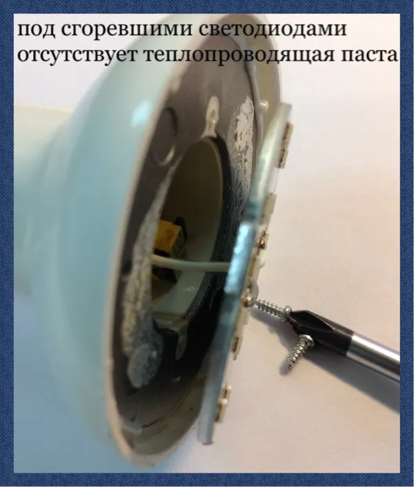 Вот тебе и на! Как раз под нашими сгоревшими светодиодами отсутствует специальная теплопроводящая паста ( смотри белые пятна на метале-это теплопроводящая паста) . Теплопроводящая паста как раз и нужна для того, чтобы эффективно отвести тепло от нагретого участка к радиатору охлаждения. А пасты то тут и нет!
