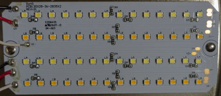На каждом таком модуле располагается по 56 светодиодов 2835. 28 светодиодов с температурой 6500K и столько же с температурой 2700K. По мимо светодиодов на модулях так же имеются токоограничивающие резисторы. Всего на светильнике получается 504 светодиода. Напряжение на светодиоде на максимальной яркости 2.97 вольта.