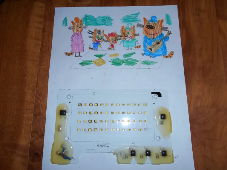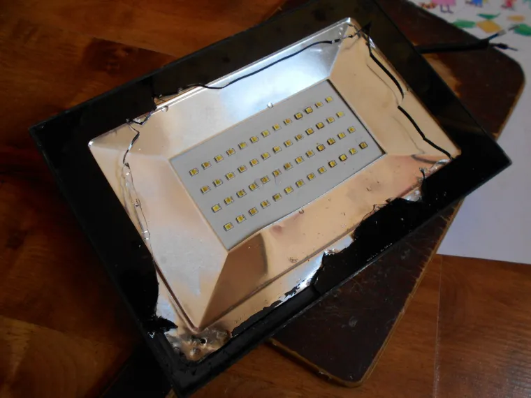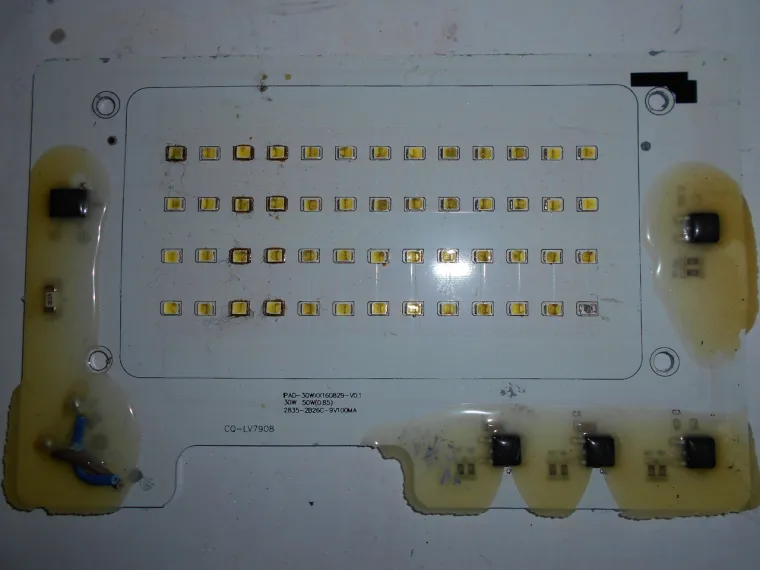 @Схемотехник 1.Светодиоды трехкристальные 9 Вольтовые с номинальным током 100 мА. Всего их 52 на плате . Получается 46,8 Вт . Был бы новый прожектор тогда и разбирать не нужно . Если его фактическая мощность не превышает 50 Вт , то как бы и должен работать долго ? 2.Светодиоды собраны в схему попарно - последовательно 26 пар . 3., 4., 5.... следовал совету из YouTube , цели отремонтировать прожектор не ставил
