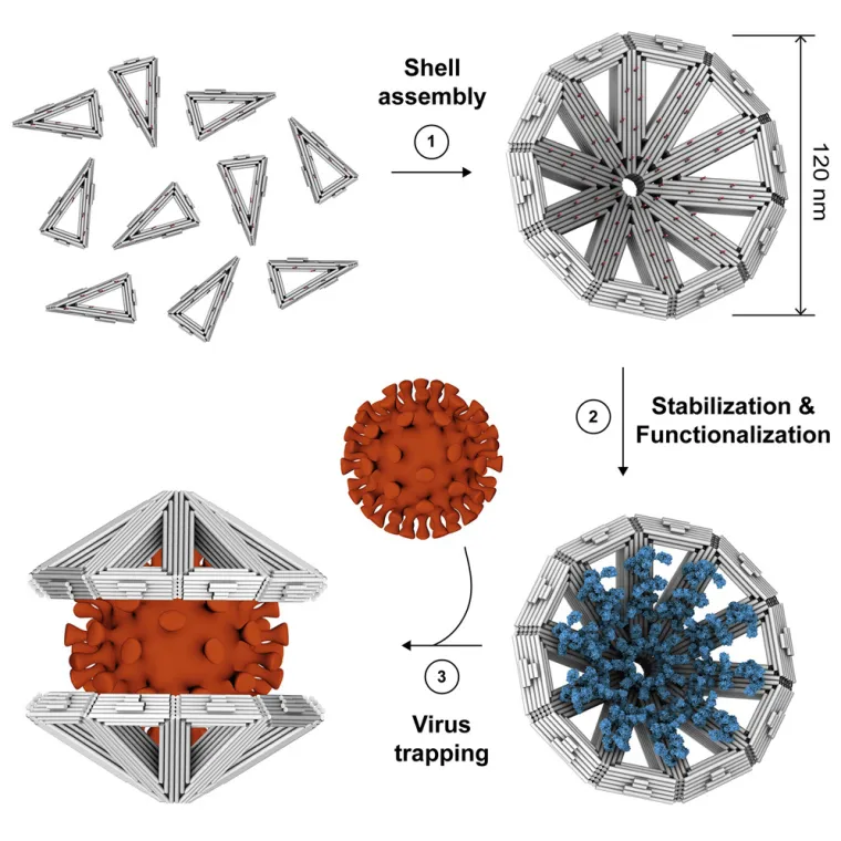 Процесс воздействия в процессе тестирования техники заключался в следующем: каждый треугольник внутри был покрыт гепарансфльфатами (вирус-объединяющие элементы, которые схожи с антителами). На выходе получалось, что треугольники смыкались вокруг вируса, как бы склеиваясь, формируя своего рода клетку. Созданная ловушка способна изолировать и удерживать вирусы размером более 100 нм.
