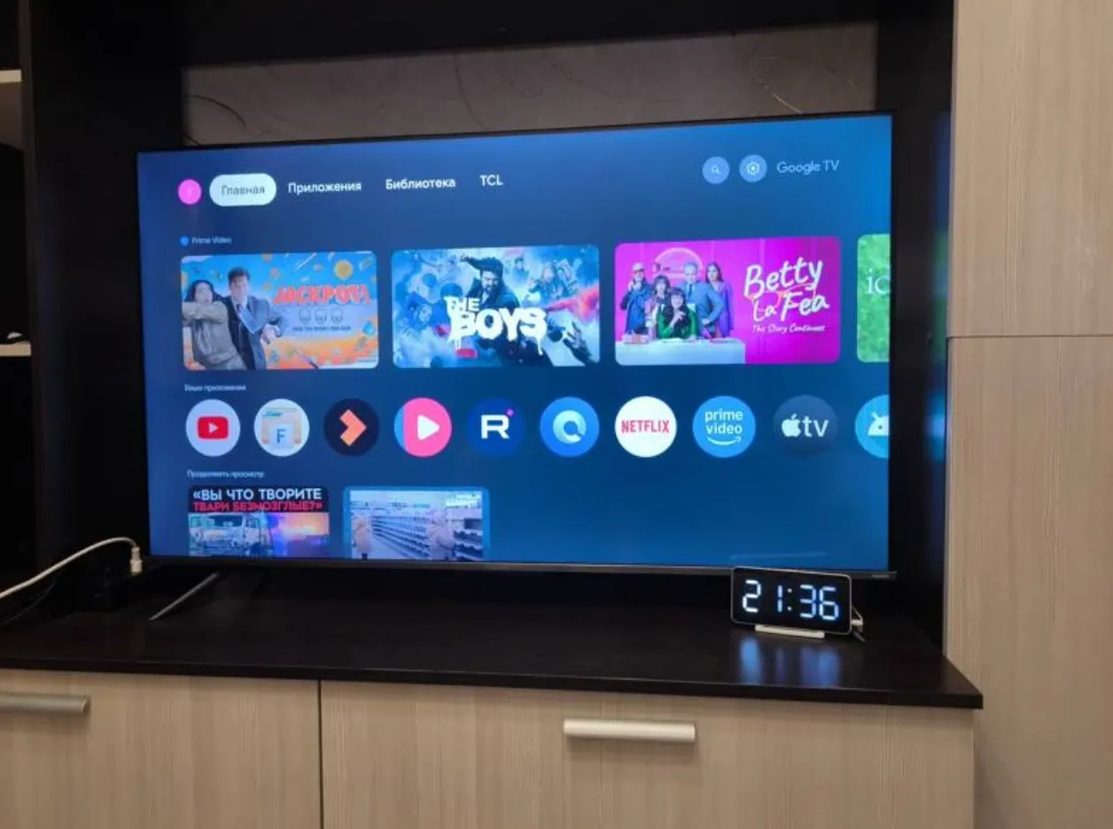 Google TV. Я просто вхожу в свой аккаунт, и телевизор сам знает, какие сериалы я не досмотрела на телефоне. Голосовой поиск на пульте работает хорошо. Я просто говорю: «Найди мультик про синий трактор», и через секунду дети счастливы. Пульт, кстати, очень стильный, с металлическими вставками, его приятно держать в руках, и он работает через Bluetooth - не нужно целиться в телевизор.