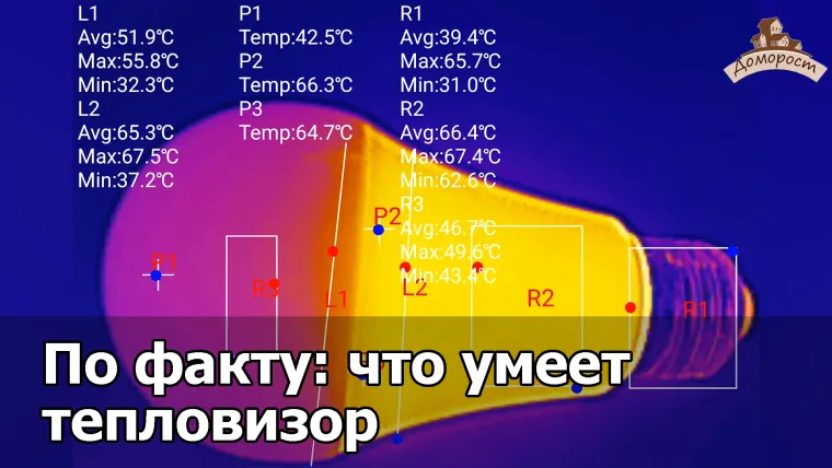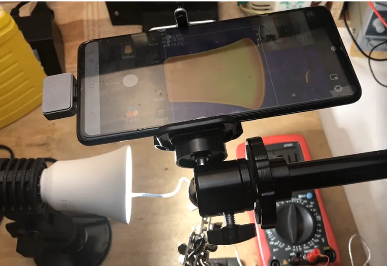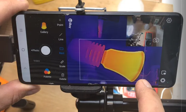 Точного соответствия показаний от термометр-термопара-пирометр-тепловизор не будет, однако кому из них на каких объектах наблюдения верить больше надо экспериментировать. Совершенно незаменимая штука смотреть на работающую печатную плату. Даже не столько важна точная температура, как очень удобно и мгновенно понятно где и что греется больше всех. Видна и динамика такого прогрева. Отлично видно как при прогреве лампы, постепенно, от диодной платы к цоколю, прогревается радиатор корпуса "композит". Смотреть прямо на ярко горящие светодиоды диодной платы не пробовал. Нет у меня, как то, уверенности, что ИК камера не "прогорит" от такого эксперимента и непонятно где предел таких её возможностей, даже кратковременных. Допустим ли режим 10 секунд смотреть камерой на диоды включенной 10W диодной платы без рассеивателя ? А допустим ли режим на 100W плату? Точных ответов нет. Но выход есть. Смотрю на диодную плату так. Проработала лампа 15 - 30 минут, выключаю и тут же, пока не остыла диодная плата, смотрю тепловизором. Очень удобно, что камеру можно подвесить не на сам смартфон, а через шнурок-удлинитель. Так её можно засунуть внутрь,например, какого то корпуса полностью не разбирая его . Т.е. можно легко дотянуться и "взглянуть" куда то в очень неудобное место. Кроме электронщиков крайне полезный прибор для строителей и специалистов по отоплению. Видно всё и сразу. Ну и возможность отложенного анализа сохраненной тепловой картинки - ну очень очень удобно.