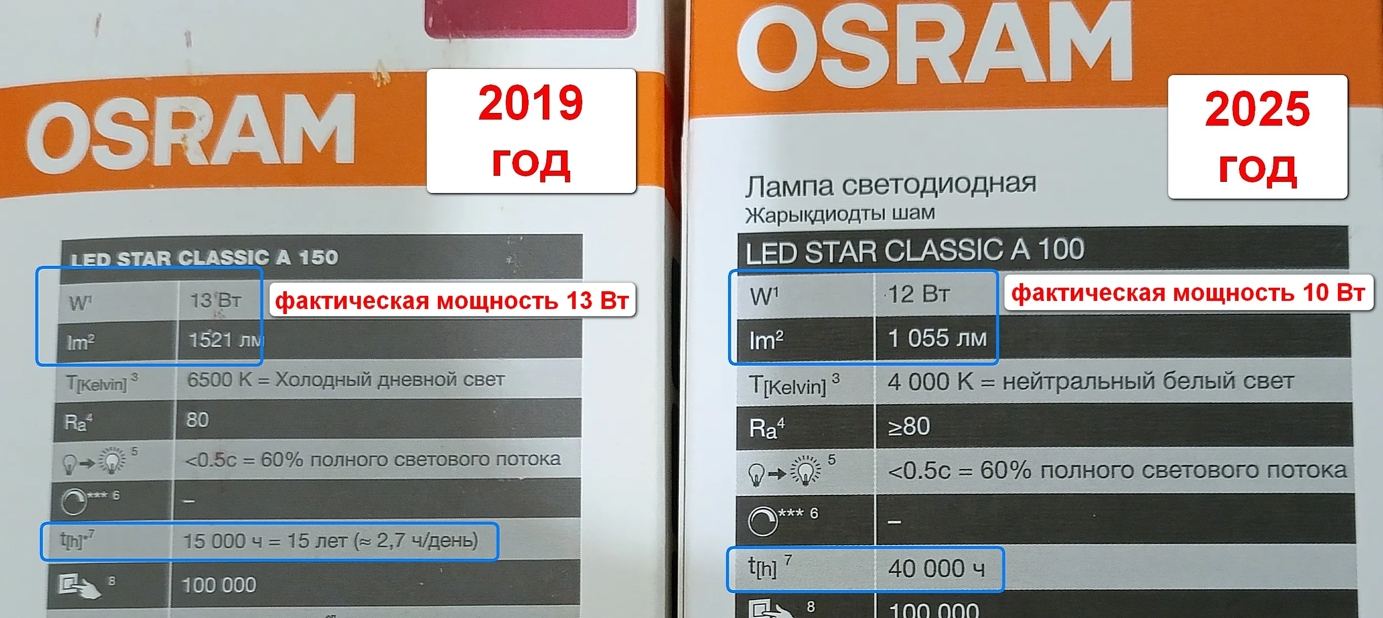 Osram , при такой же светоотдаче , указал потребляемую мощность лампы 12 W и аналог лампы накаливания 100 W . Как Вы думаете в чем секрет ?