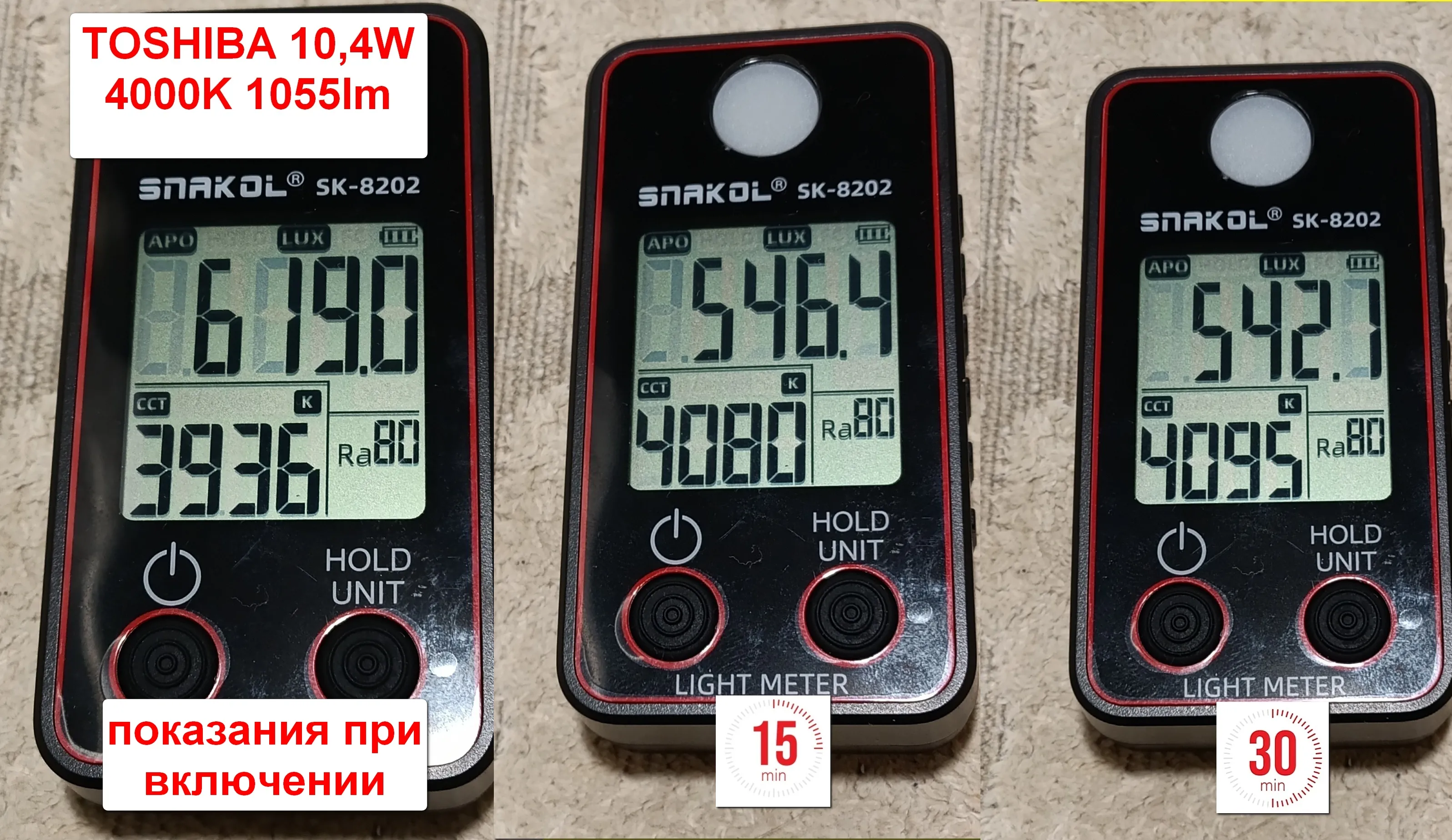 Toshiba нам обещали 1055 Лм и 11 Вт мощности . Фактическая мощность после прогрева лампы получилась 10,4 Вт . Цветовая температура при включении лампы 3936 К , а после прогрева 4095 К . Светоотдача лампы 542 lux , Ra 80 .