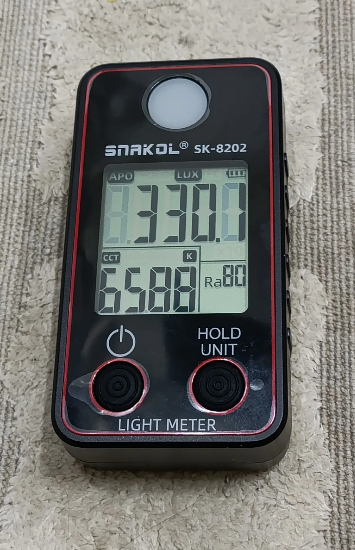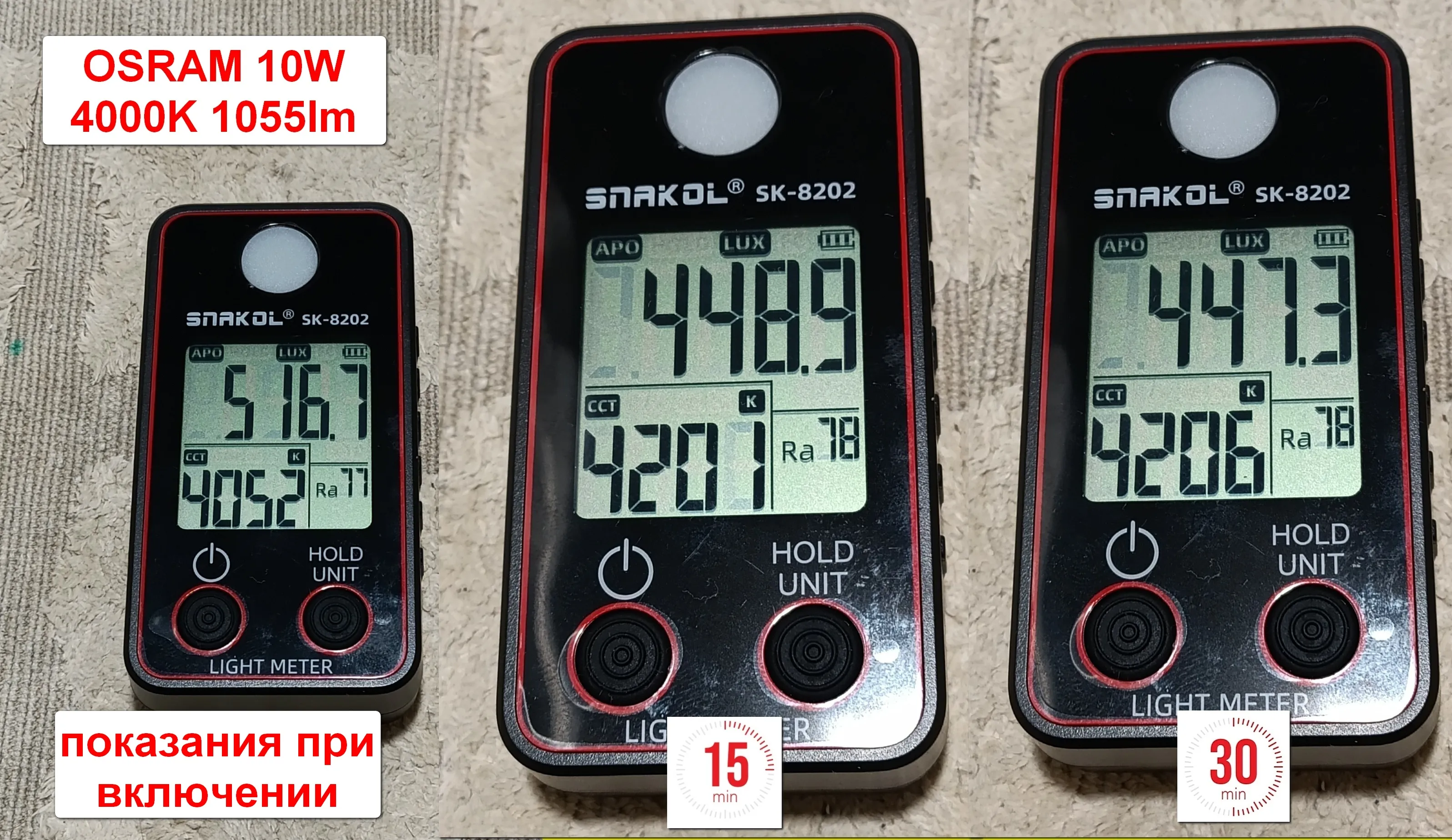 В общем тушим свет и погнали измерять. Osram нам обещал 1055 Лм и 12 Вт потребляемую мощность лампы . Ранее я уже измерил фактическую мощность и получилось 10 Вт после прогрева лампы . Цветовая температура по прибору при включении 4052 К , после прогрева лампы 4206 К . Светоотдача после прогрева 447 lux , Ra 78 .