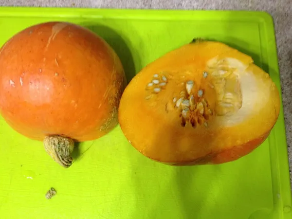 Сначала берем тыкву. Вынимаем семечки и отчищаем кожуру. Мне понадобилась половинка тыквы.
