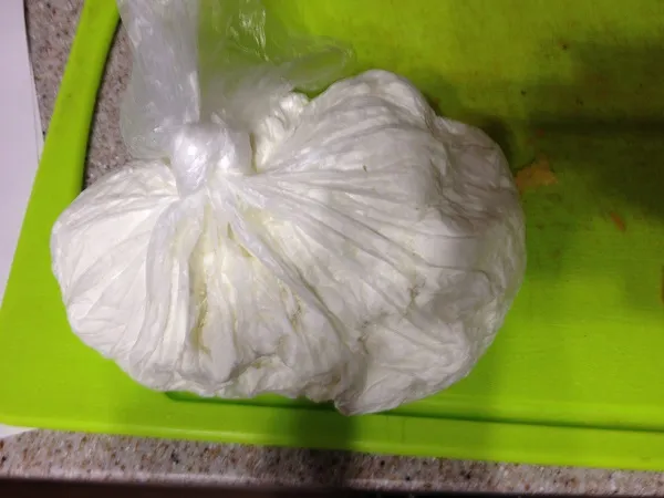 Кладем его в емкость и хорошо разминем.