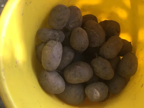 Начали копать картофель. Первым решили выкопать сорт Фиолетовый. Очень уж хотелось посмотреть что же за чудо такое. И сталкнулись с очень большой проблемой. Картофель такого цвета совсем не виден в земле. Протряхивали землю буквально через сито. Не видно! Посадила этот сорт в хорошую землю, но вот урожай не порадовал. Картошка мелковатая. Только и есть что цвет. Зато удивления на лицах знакомых. Уже приятно!