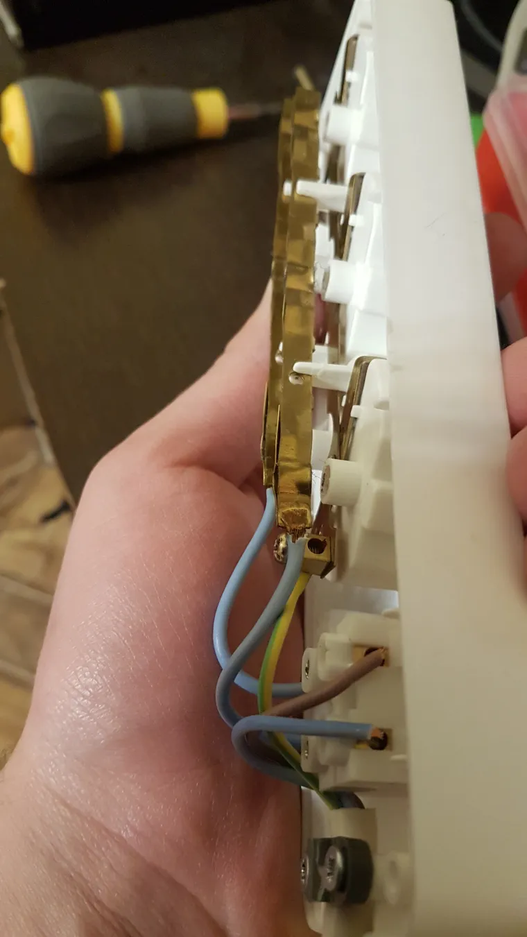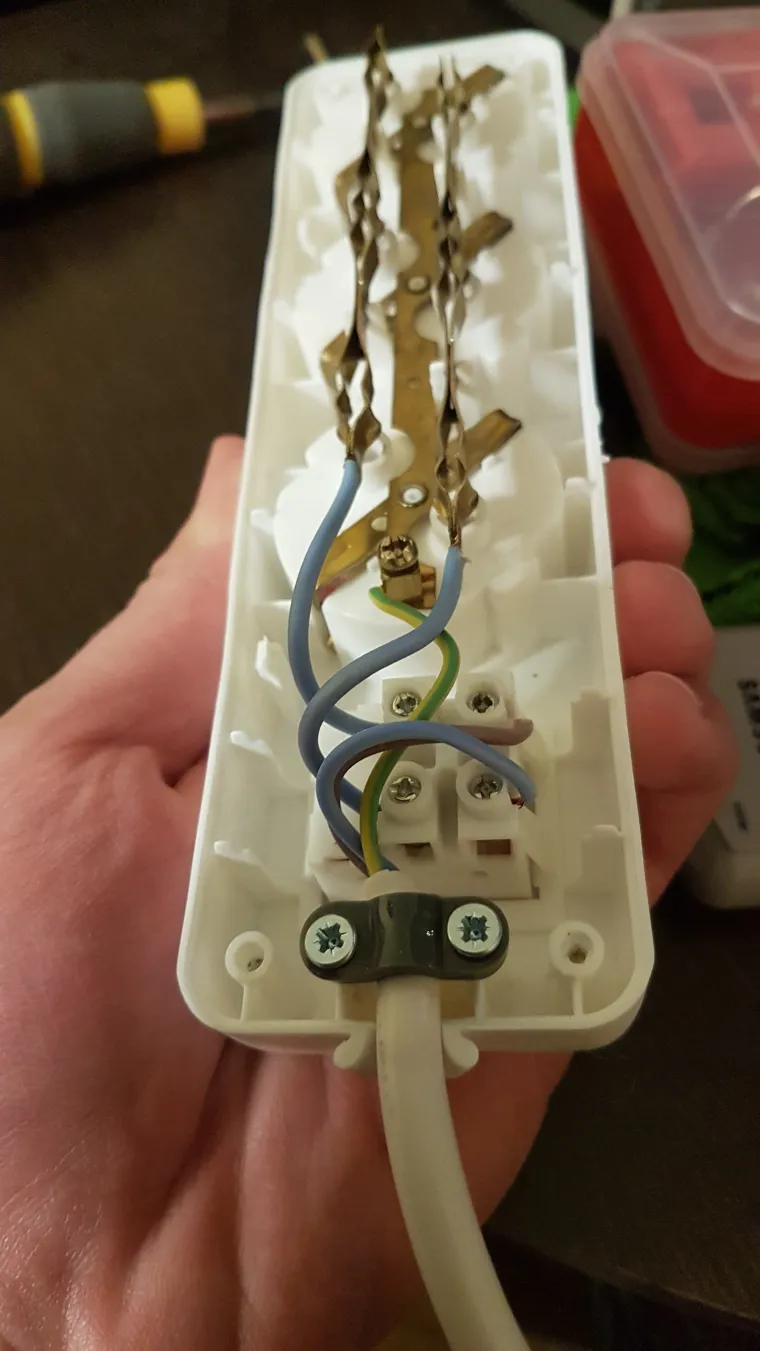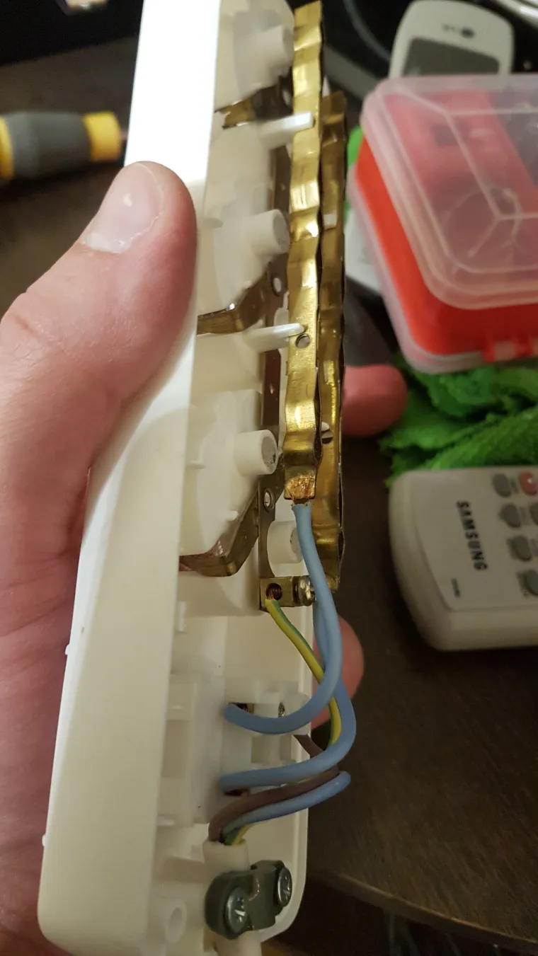 Просто разогнулись контактные пластины? Да.... Только вот крайняя розетка меня удивила тем, что с одной стороны её контакты ничем не прижаты и могут расходиться в разные стороны. Уже минус производителю, не предусмотрел он этот момент! Да и материал слишком легко гнется и не пружинится! Сетевые провода подключаются клеммами, что меня уже радует, кнопка имеет винтовое соединение, это значит, в случае её поломки ничего не придется паять, а в случае поломки всего удлинителя кнопку можно будет взять для дальнейшего использования в другом месте, для этого не понадобится паяльник.
