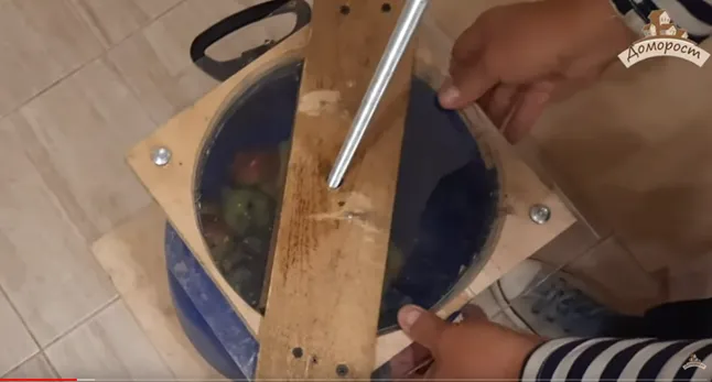 В яблокодробилке на дне бочки лежит круглый опорный диск вырезанный из толстой фанеры.