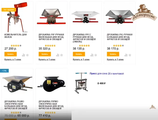 и оправдают они себя скорее только на каких то уже производственно-коммерческих проектах, а не на личных сезонных заготовках яблочного сока. Если хороший 20 ти литровый пресс стоит вполне разумные деньги, около 8000 рублей , то хороший измельчитель для яблок это уже заметно более 20000 рублей. Никто не готов к таким затратам ради сезонов яблочного изобилия. Не вариант и всякие дешевые фермерские ручные и электро измельчители для корма животным и птице, яблоки им не по зубам ,они умирают от большого урожая яблок быстрее бытовых соковыжималок. Не вариант и просто бытовые кухонные измельчители, блендеры, мясорубки .