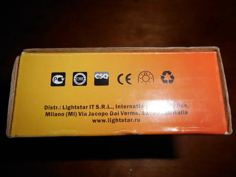 И так предлагаю рассмотреть лампу от LightStar , заявленная мощность 6 W . Артикул 929062. Информация на упаковке отличается от информации на лампе . На коробке нарисована лампа в (алюминиевом?) корпусе с оребрением . Заявленная цветовая температура 2800 К