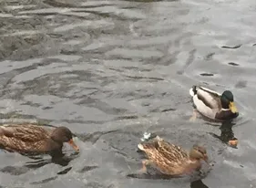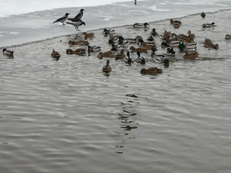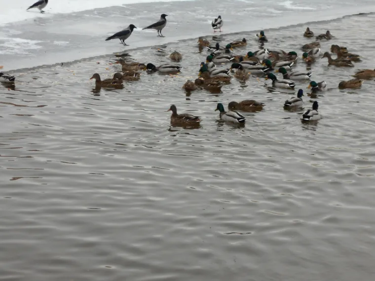 В Москве в Москва-реке утки остаются на зиму, в незамерзающей воде. В подмосковных речках никогда не видела, чтобы утки оставались на зиму. И вот тут удивительное дело! И в нашей маленькой прозрачной речушке увидели 2 уточек и селезня.