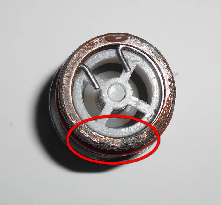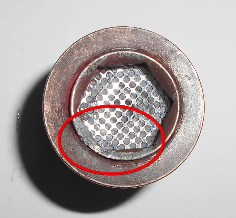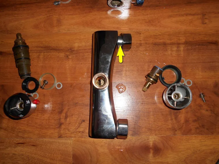Разборка термосмесителя с Алиэкспресс под названием BONADE показала , что патрубки (указал желтой стрелкой) изготовлены из этого самого силумина. Это не латунь и не бронза , а самый настоящий силумин и его нещадно разъедает вода