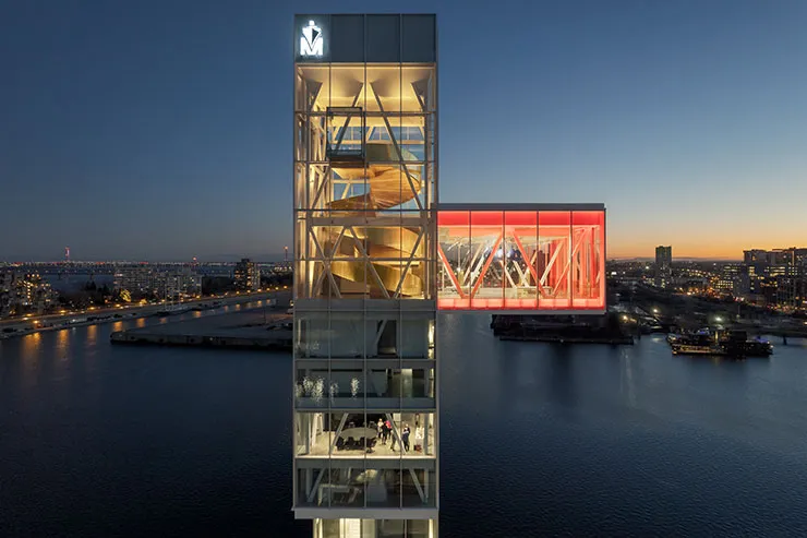 Прозрачная башня-маяк имеет современный дизайн, при этом своей архитектурой напоминая об исторических зерновых башнях, которые раньше служили перевалочными базами для грузов, которые потом развозились на промышленные склады у причалов. Естественно, башни в прошлым не были прозрачными. Современное строение построили из монолитного бетона с консольными стеклянными объемами и прозрачными навесными стенами, на контрасте с которыми находятся горизонтальные навесы.