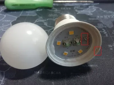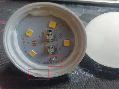 Один из читатетелей наших обзоров пишет, что в сети магазинов фикс-прайс активно продаются лампочки, которые уже ремонтировали. Обращает внимание на то, что на ободке виден след от паяльник, а также один светодиод закоротили.