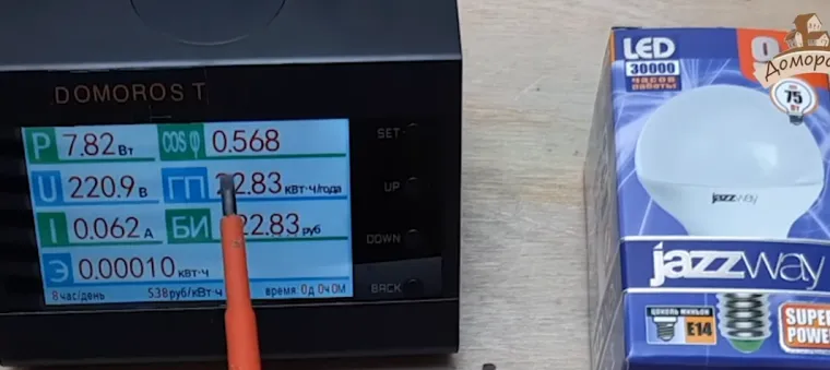 если подставить значения мощности, напряжения и CosF которые на картинке на приборе то получаю 7,82/(220,90,568) = 0,062А это тот ток, который течет как раз в том предохранителе, который в проводе 220 вольт внутри лампы. 2)Если в этой лампе драйвер был бы совсем плохой и CosF был бы не 0,568, а пусть, например, 0,3 тогда ток в предохранителе лампы был бы в два раза больше , он был бы 7,82/(220,90,3) = 0,118А 3)Если в этой лампе драйвер был бы совсем хороший и CosF был бы не 0,568, а пусть, например, 0,9 тогда ток в предохранителе лампы был бы