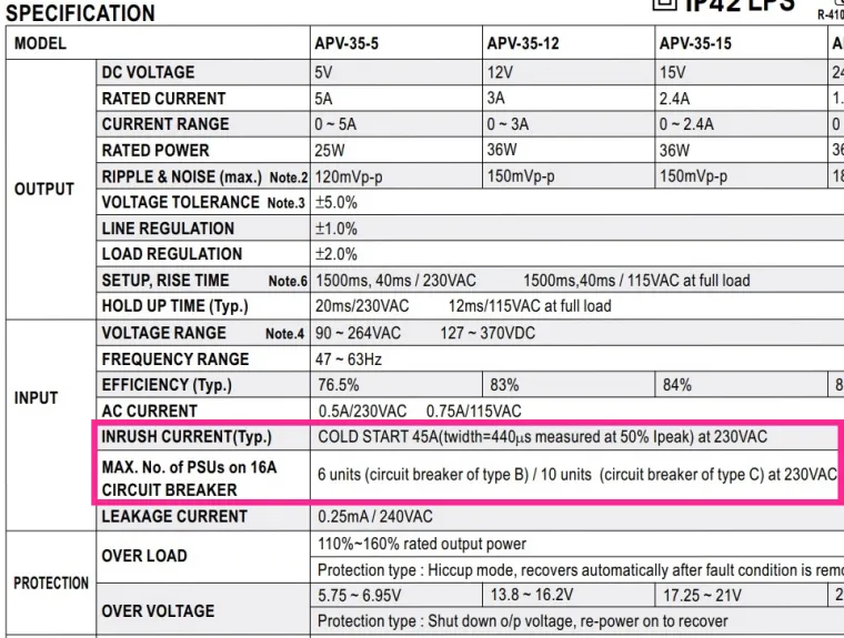 А мы не говорим, хороший он или плохой. Просто у него есть свои особенности... Ищем документацию на блок питания "Mean Well AC/DC APV-35-12". Находим ее и смотрим, что там написано... А написано там следующее: 1. INRUSH CURRENT(Typ.): COLD START 45A(twidth=440 us measured at 50% Ipeak) at 230VAC 2. MAX. No. of PSUs on 16A CIRCUIT BREAKER: 6 units (circuit breaker of type B) / 10 units (circuit breaker of type C) at 230VAC