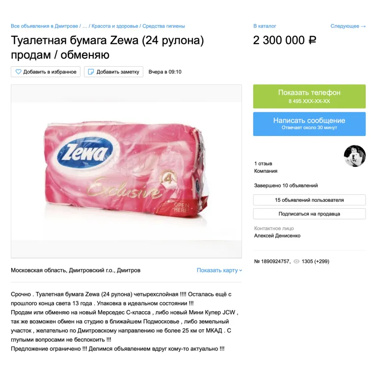 Ради шутки или всерьез решил разместить объявление житель Дмитрово Алексей Денисенко на одном из бесплатных ресурсов. Зачастую подобные вещи расцениваются как анекдот, который быстро рассеивается по социальным сетям и мессенджерам. Однако у Алексея это уже не первый опыт продаж через интернет ненужных вещей. Конечно же, с датой конца света он слегка промахнулся, ведь согласно календаря майя он должен бы наступить еще в 2012 году. Кто знает, может сохранившаяся в целости туалетная четырехслойная бумага 2013 года найдет своего почитателя.