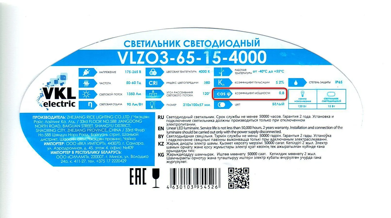 Перед нами светильник с заявленной мощностью 15 Вт . Если верить характеристикам в нем импульсный драйвер . И вот оно , наконец-то ! Коэффициент мощности 0,8 !