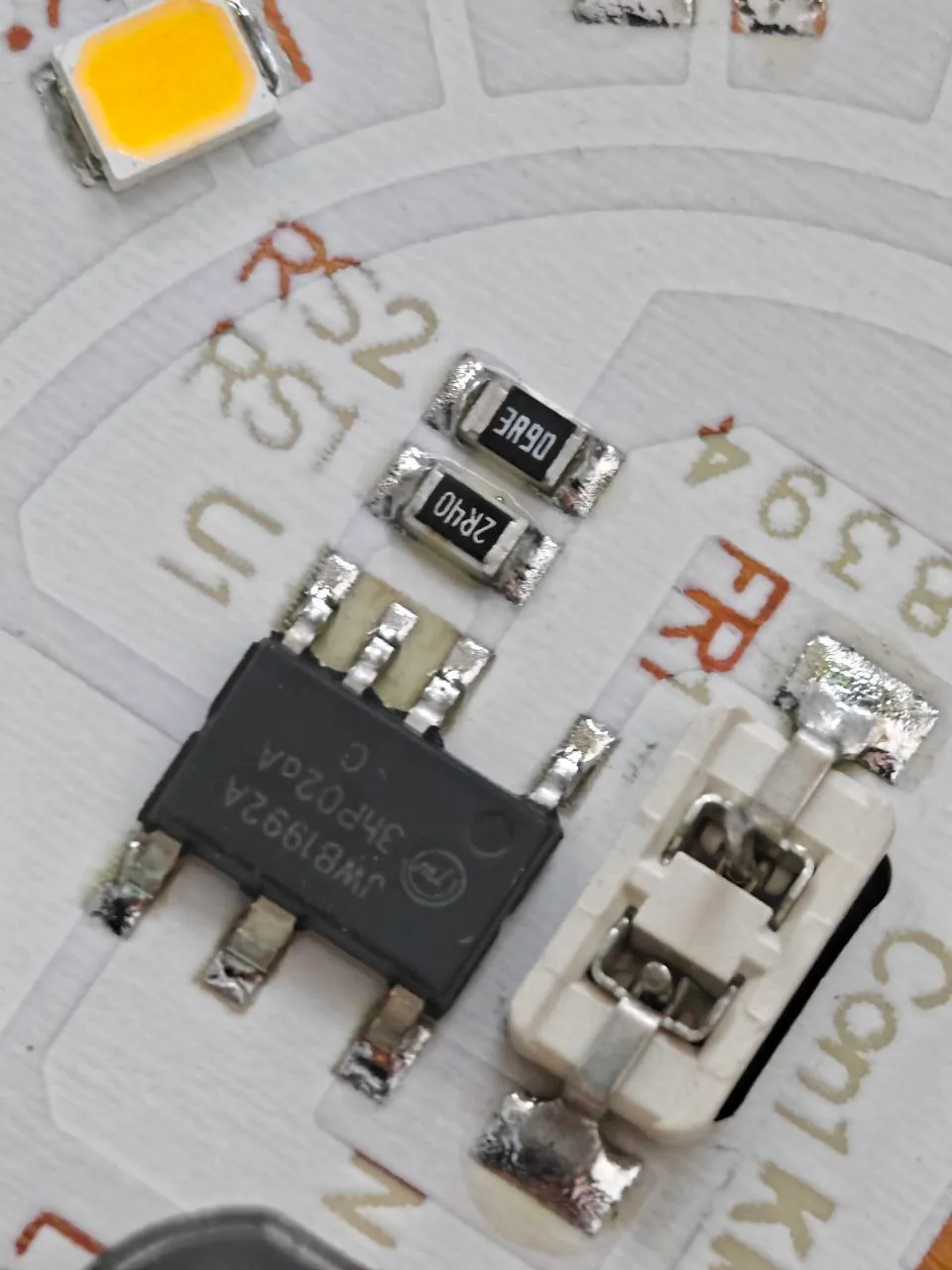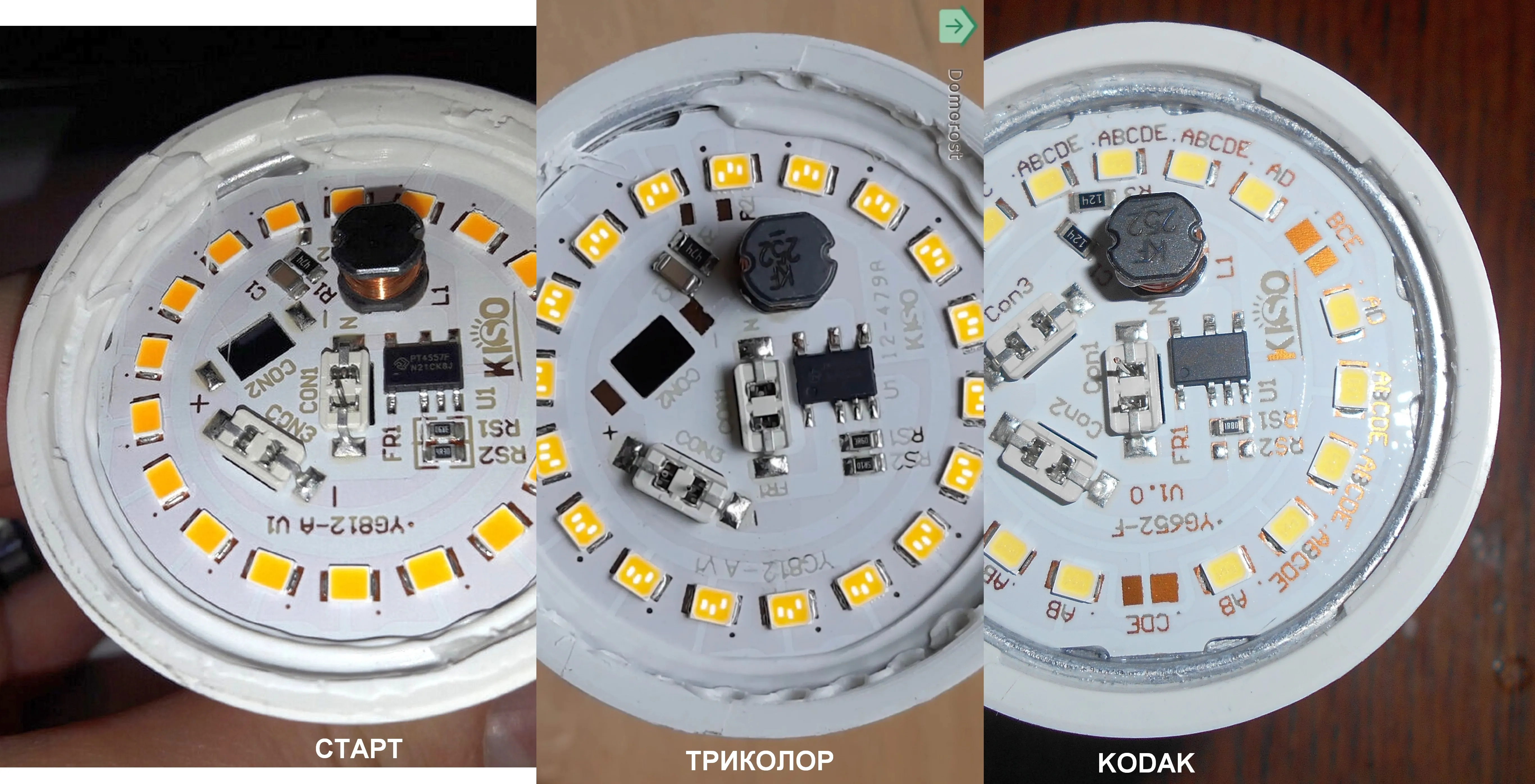 Внесу свои 5 копеек приобрел лампу триколор только на 18 Ватт схематехника та же самая что и у лампы на 15 Ватт, только светодиодов больше и плата шире колба 65 мм вместо 60 мм. По мне в стоке горячая, корпус нагревается 80+ градусов, но отпаяв/сковырнув резистор RS2 получаем примерно 12 Ватт и температуру 65 градусов уже не плохо, а если вместо RS2 сковырнуть/отпаять резистор RS1 мощнось становится примерно 9 Ватт и температура ниже 45 градусов, такая лампа прослужит очень долго (в теории 10+ лет), а яркости ее вполне достаточно (если не хватает ставте 2 через раздвоитель). Сам резистор находится в удобном месте для отпаивания, да колбу можно снять быстро не повредив рассеиватель. В общем за подбор резисторов однозначно зачет инженерам! По акции за 125 рублей за офигенскую 9 ватную лампочку (после переделки) считаю что круто.