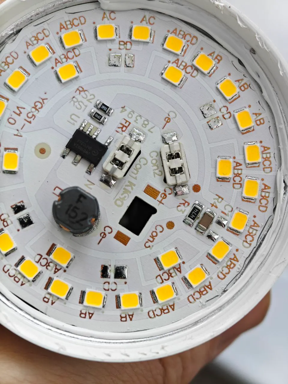 Что-то странное. По коэф. мощности лампа не дожата, измерен на уровне 0,612. Если б был бы 0,5 было б логичнее, а что логичнее? Пульсации света менее 1%, притом нет конденсаторе на выходе драйвера. В своей самодельной лампочке достичь таких показатель удалось только увеличением емкости на выходе драйвера с 2.2 мкф до 3.2 мкф + добавление помехоподавляющего конденсатора и то вышло 1,27%, а тут данной емкости вообще нет. А также входная емкость была с запасом, коэф. мощности был 0,5. Возможно тут супер-микросхема стоит, но я не припомню ламп без конденсаторов на выходе с пульсациями 1% и менее.